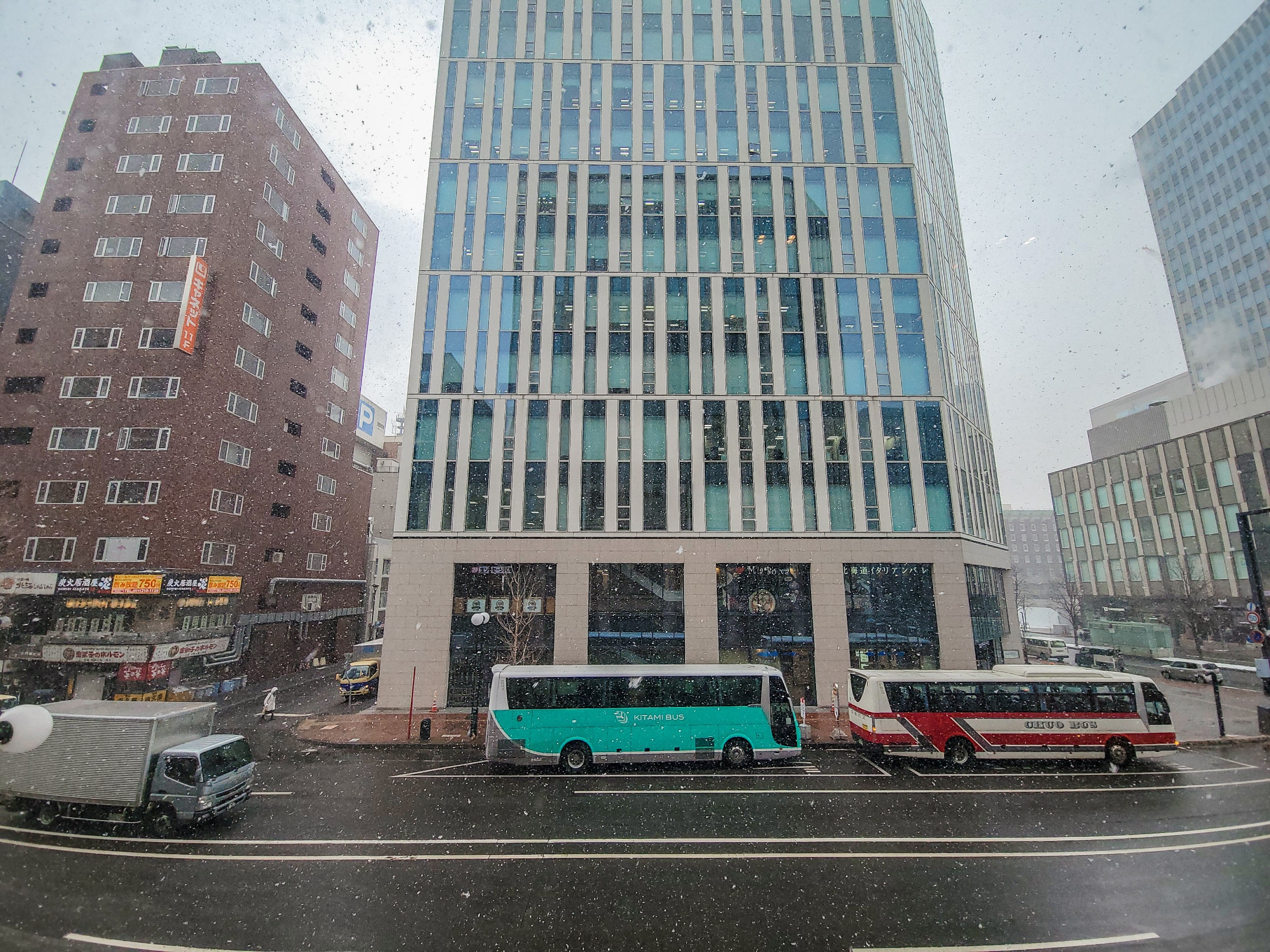 店の一番奥、外の景色を眺められるカウンター席に案内されました。席に着くと、ちょうど雪が降り始めるのが見えました。