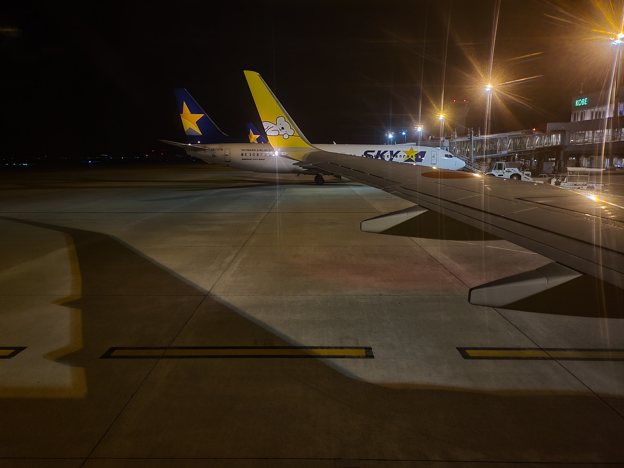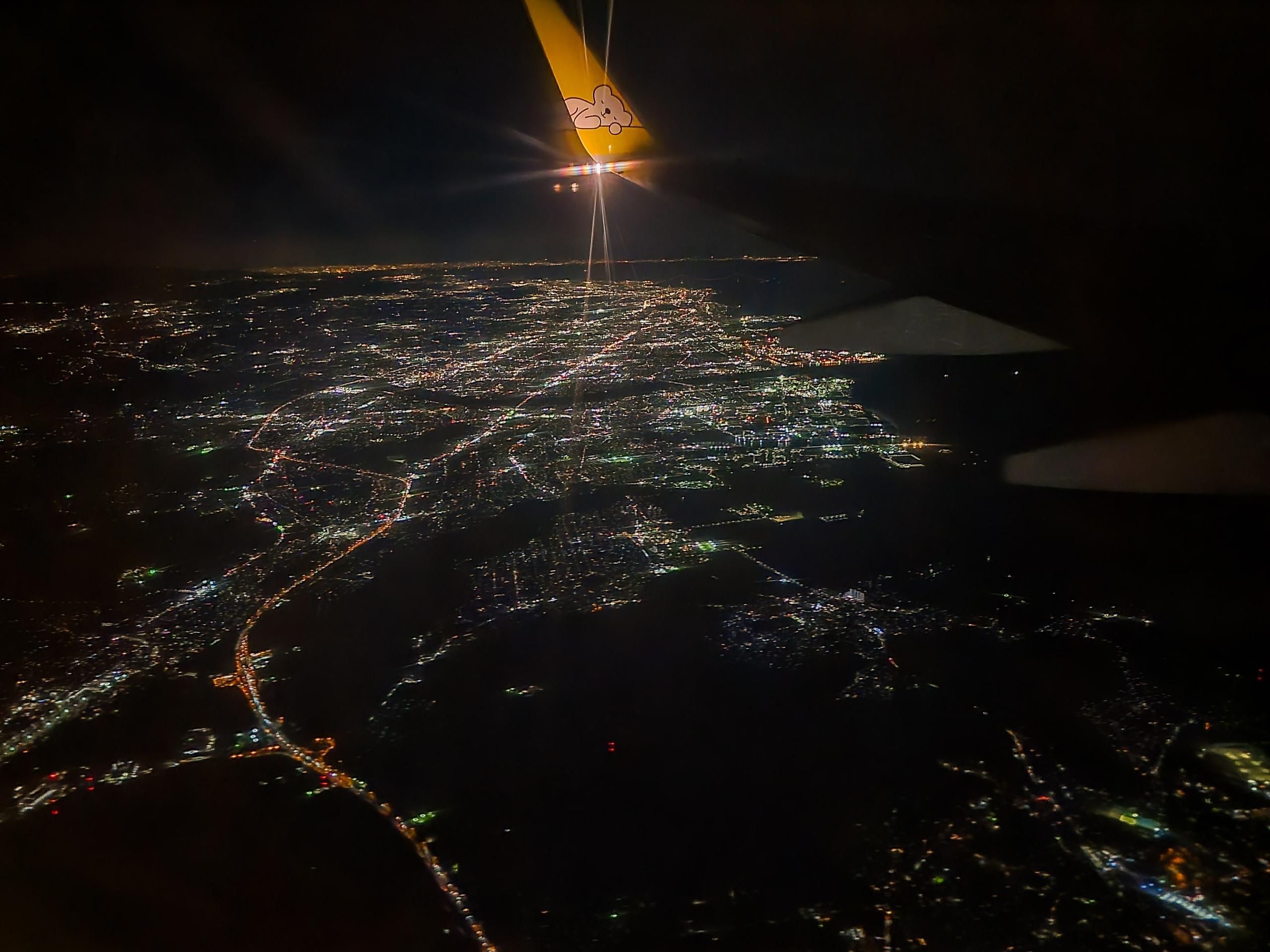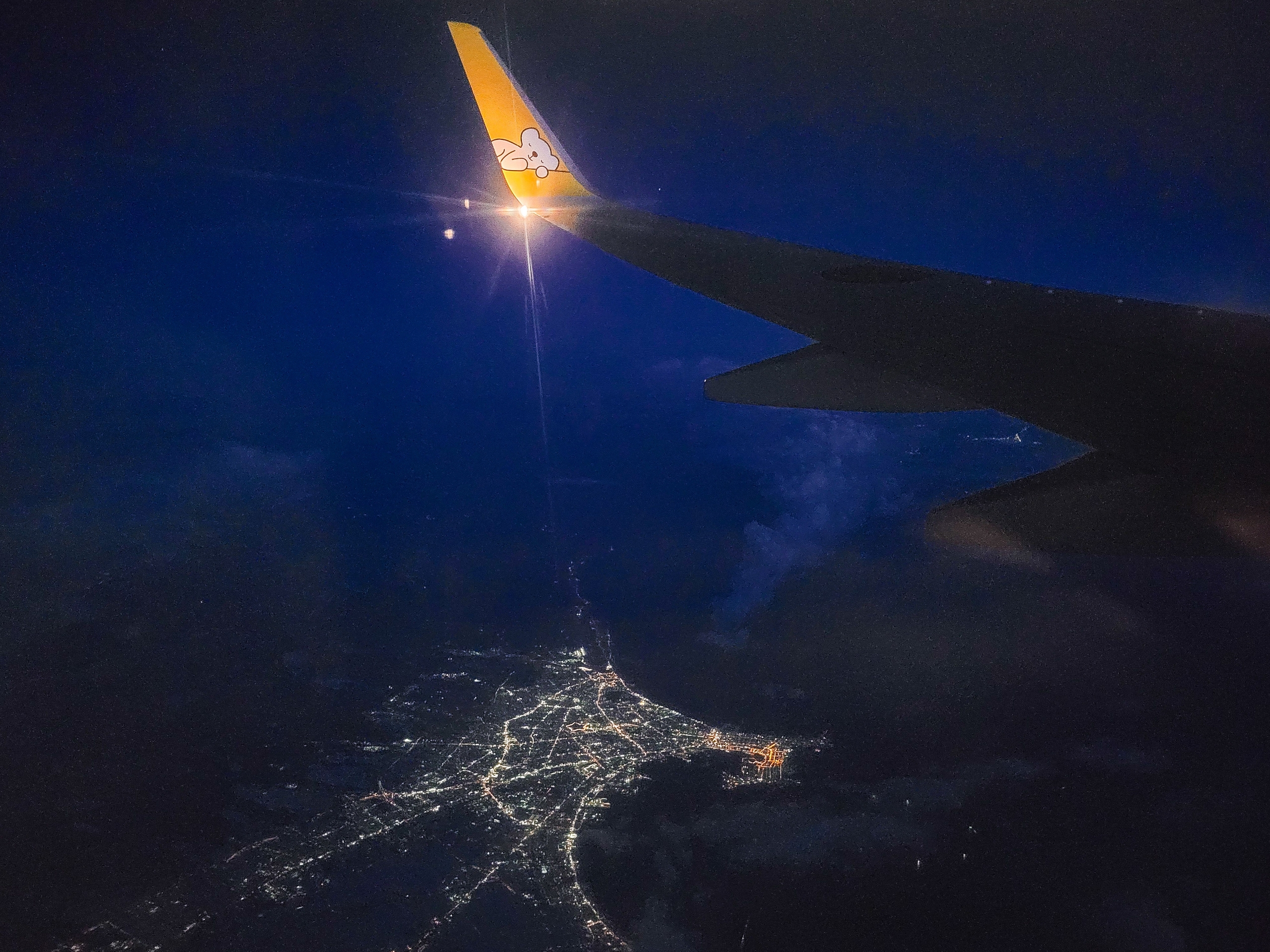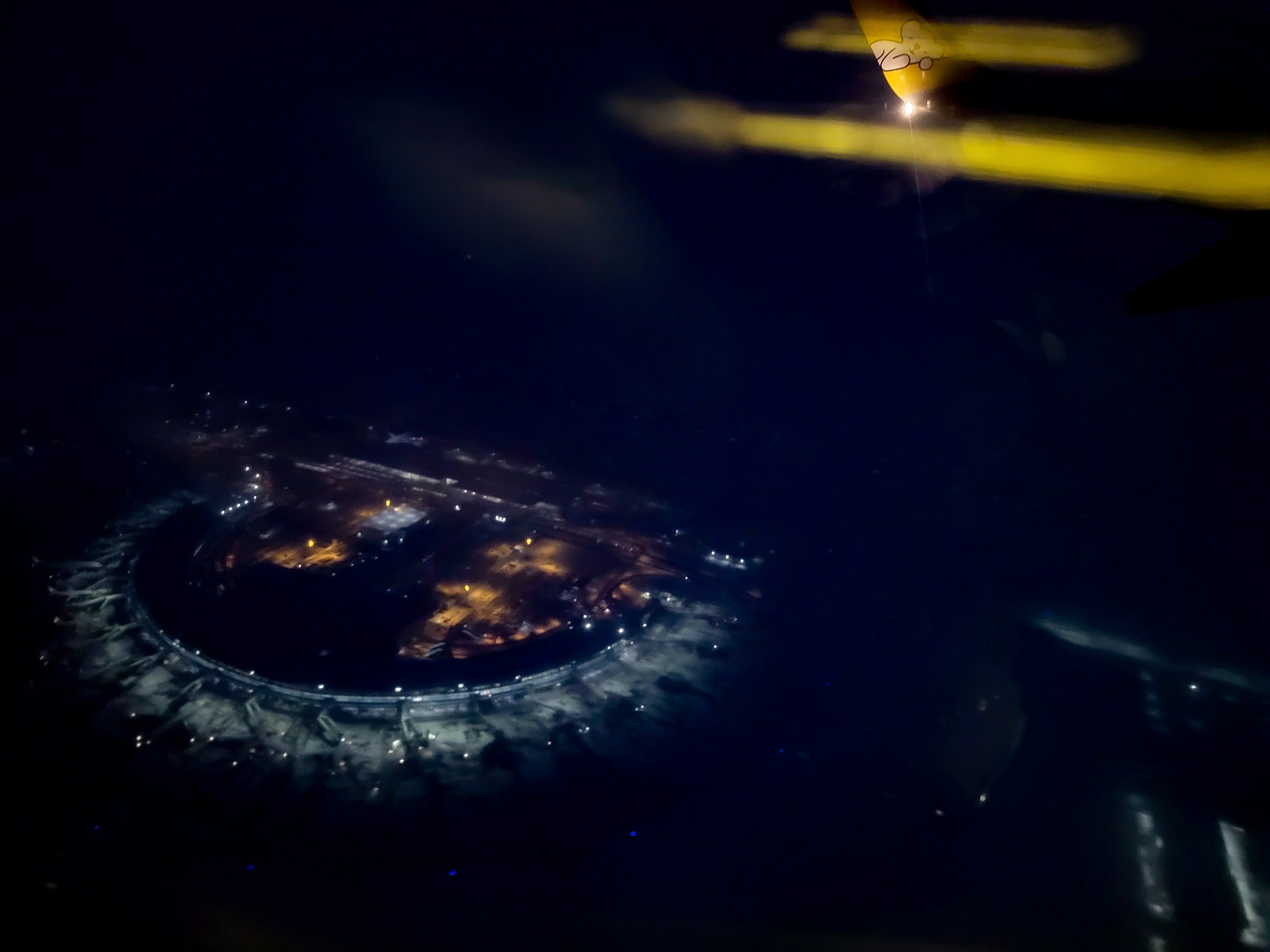新千歳空港の国内線ターミナルが下方に見えています。機内の光が窓に映り込んで写真が撮りにくかったものの、スマホをガラスにぴったりと付けて、どうにか撮影できました。