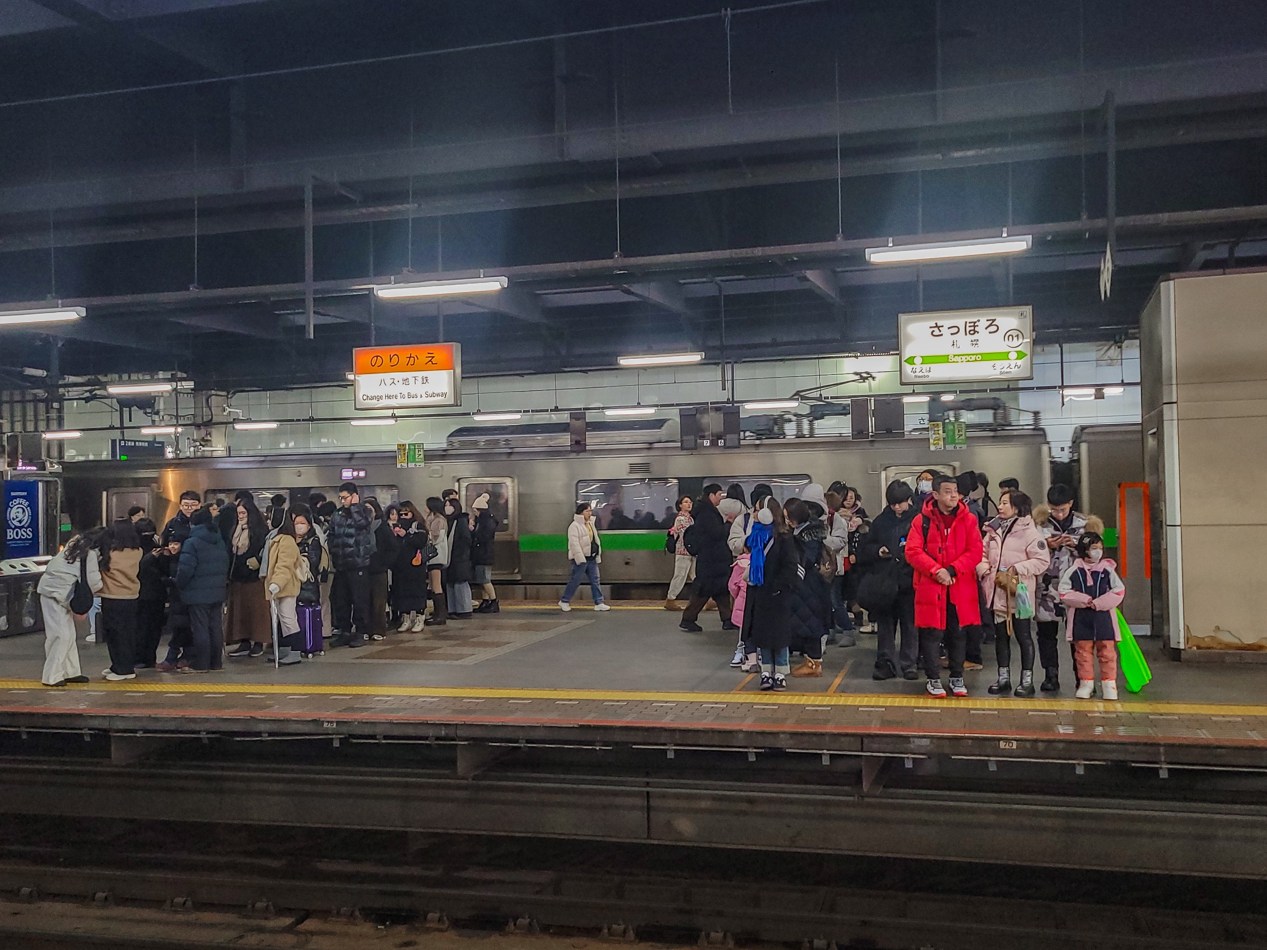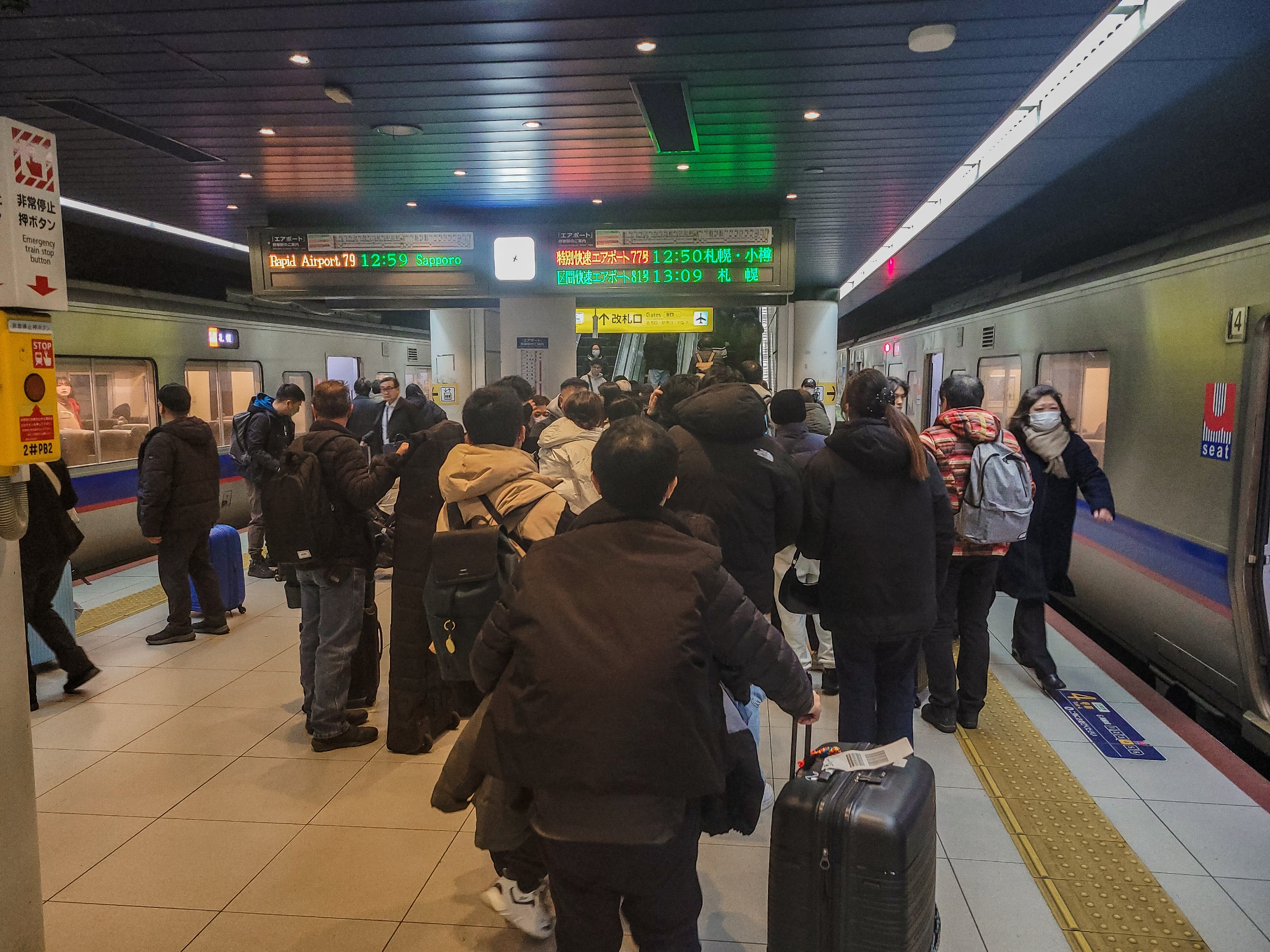 小樽方面のホームには乗車待ちの長い列ができていました。小樽運河あたりの光景を想像するだけでぞっとしますね。