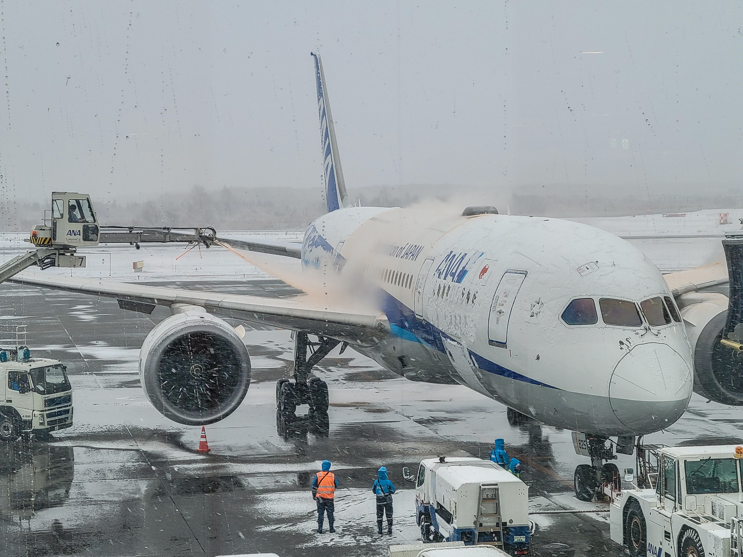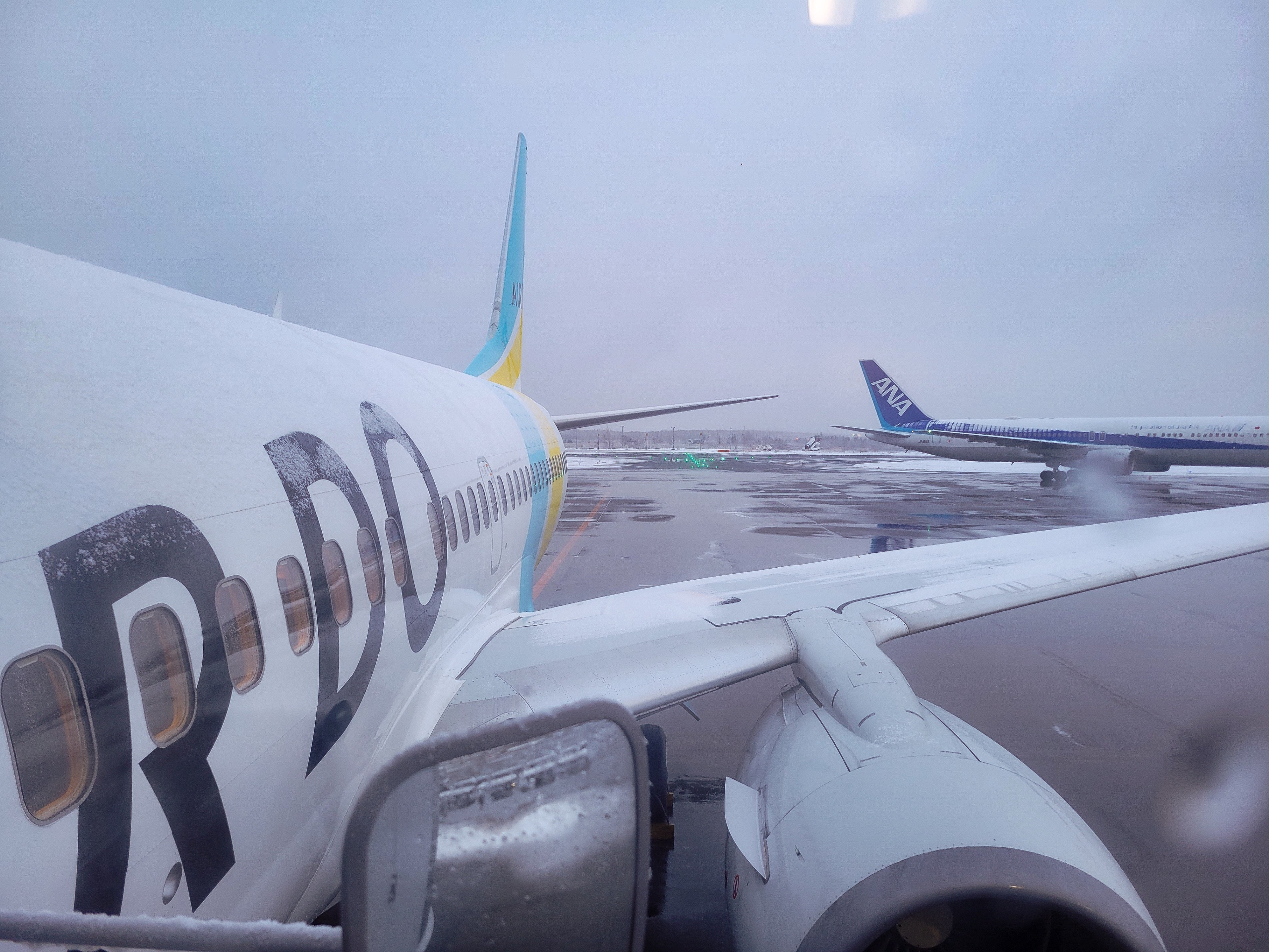 搭乗しましたが、まだ雪が降っていたので、機体に凍結防止剤が丁寧に塗布されていました。作業も大変だけど、この費用っていくらぐらいするのかも気になったり。作業が終わって、機体は動き出した時には出発時刻を20分すぎていました。