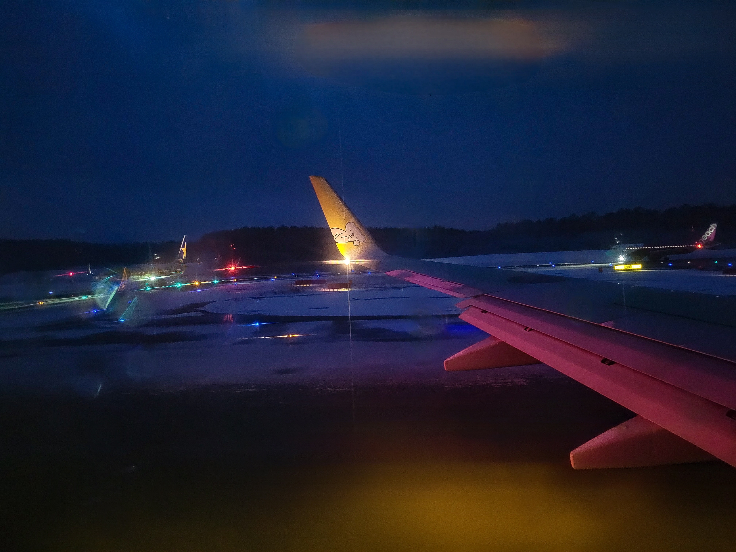 滑走路への移動中も雪が降り続いていたので、離陸前に副機長さんが客室から翼を丁寧に見ていました。「離陸に問題ありません」という機内アナウンスがあり、ようやく出発です。もう周辺は暗くなっていました。後にも離陸を待つ飛行機が順番を待っていました。