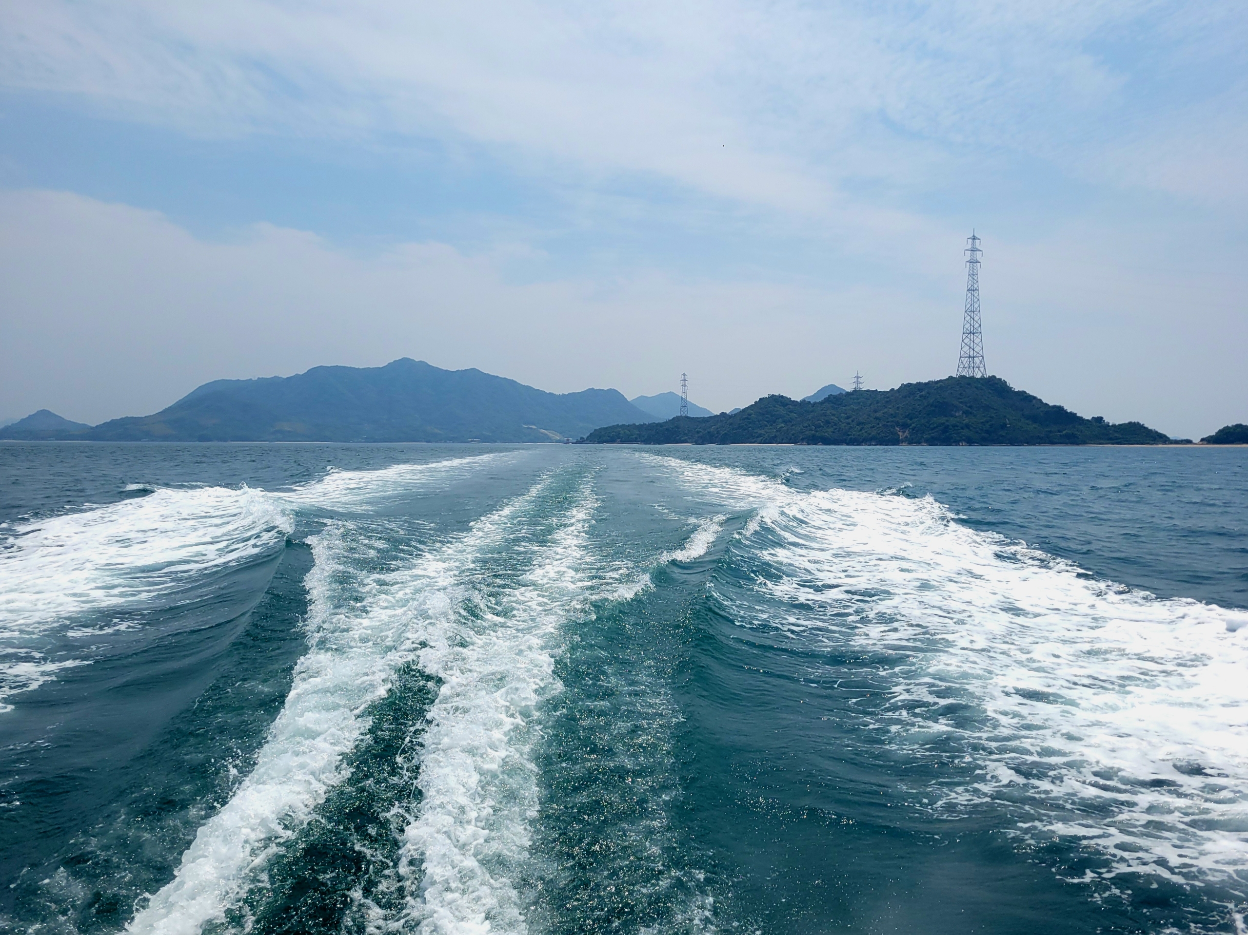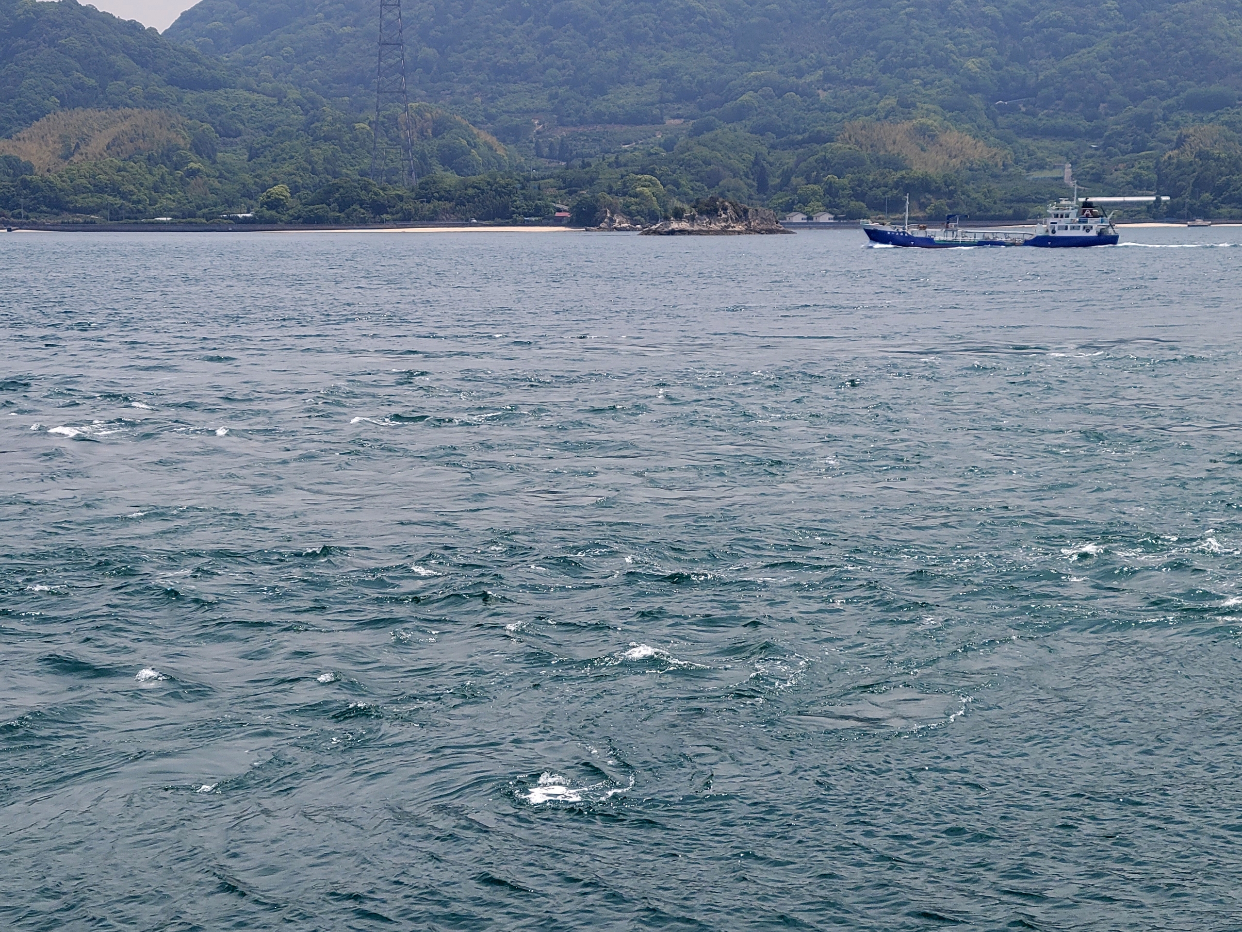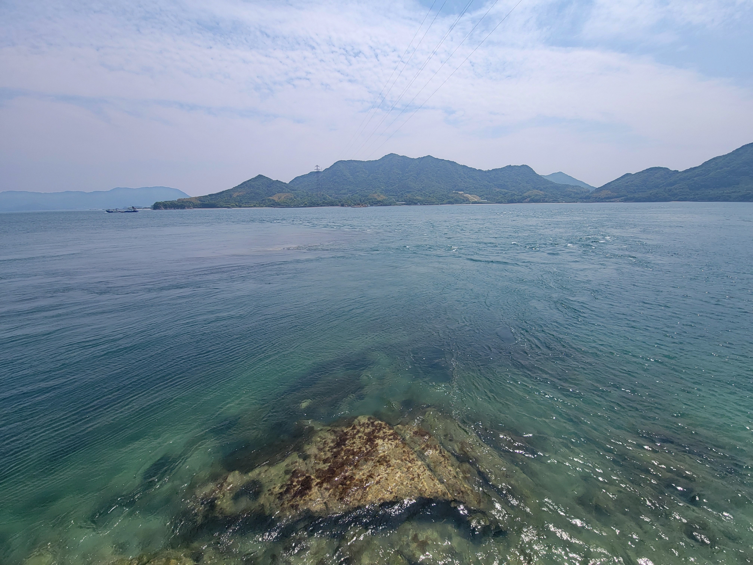 対岸に見える大三島との間には、ものすごい速さの潮流が流れていました。瀬戸内海は干潮と満潮の差が大きく、外海との出入口では特に大きな流れが生じます。大久野島の位置をよく見てみると、南側には日本三大急潮流の一つとしても知られる来島海峡があります。四国、大島、来島、そして大久野島、本州へと続くこのラインが、まさに瀬戸内海と外海を結ぶ重要な出入口になっているため、このような激しい潮の流れが生まれるのですね。