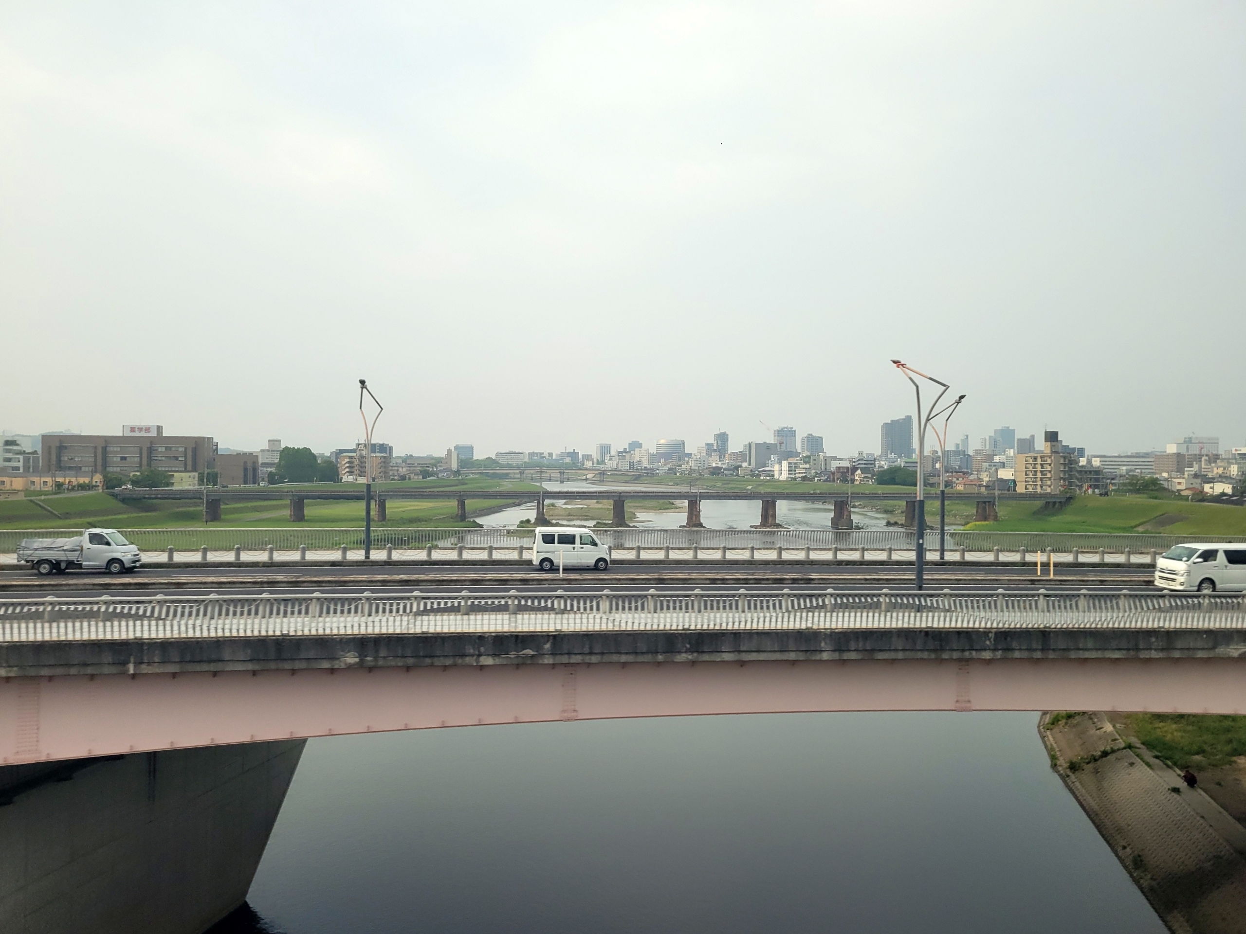 列車が西へと進むにつれて空が少しずつ明るくなり、やがて「大都会岡山」のビル群が視界に飛び込んできました。この後、新幹線は大きく左にカーブを描き、岡山駅へと到着します。