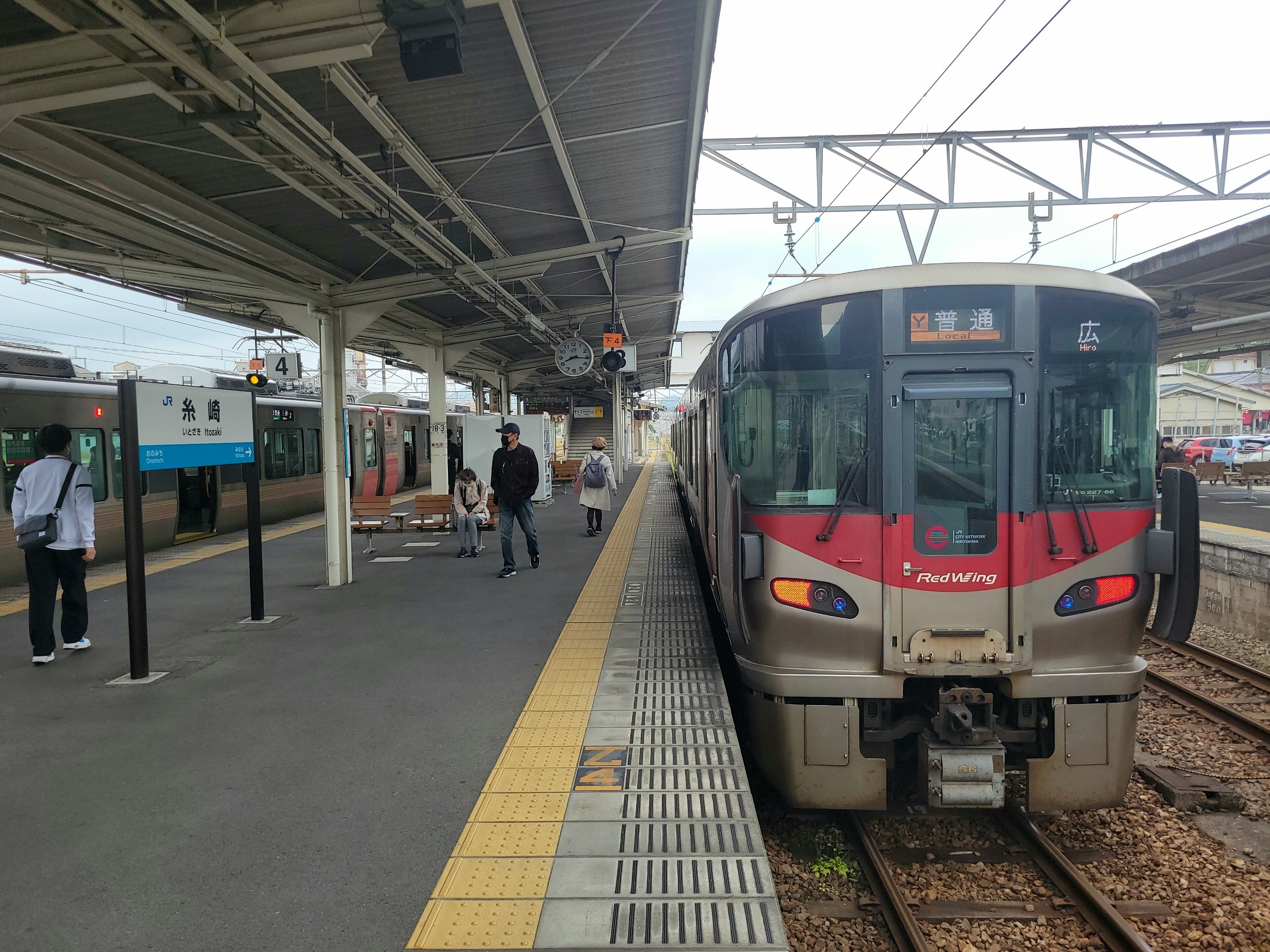 糸崎駅で列車を乗り換えます。JRの運行において岡山方面と広島方面の境界駅としての役割を担っています。福山駅から西へ向かう列車は、この糸崎駅で系統が分離されることが大半ですが、一部は三原駅まで直通することもあります。