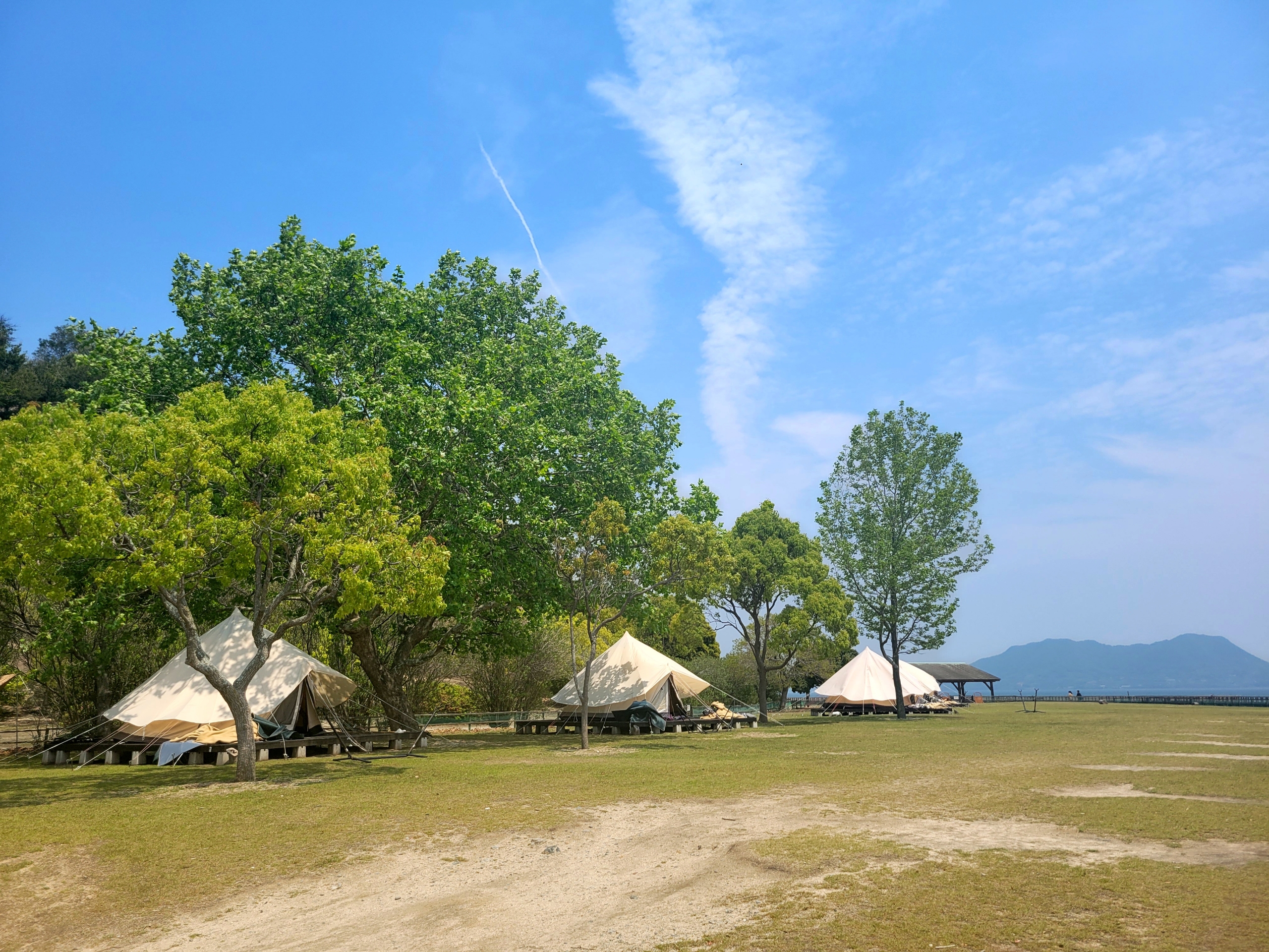 休暇村大久野島が運営する「大久野島キャンプ場」は、設営済みのテントに泊まり、食事やお風呂は休暇村の施設を利用するといった、手軽な「なんちゃってキャンプ」体験ができます。もちろん、テントや食材を持ち込んでの本格的なキャンプも可能です。キャンプ場周辺にはたくさんのうさぎが生息しているため、うさぎ好きの方にはたまらない環境でしょう。
