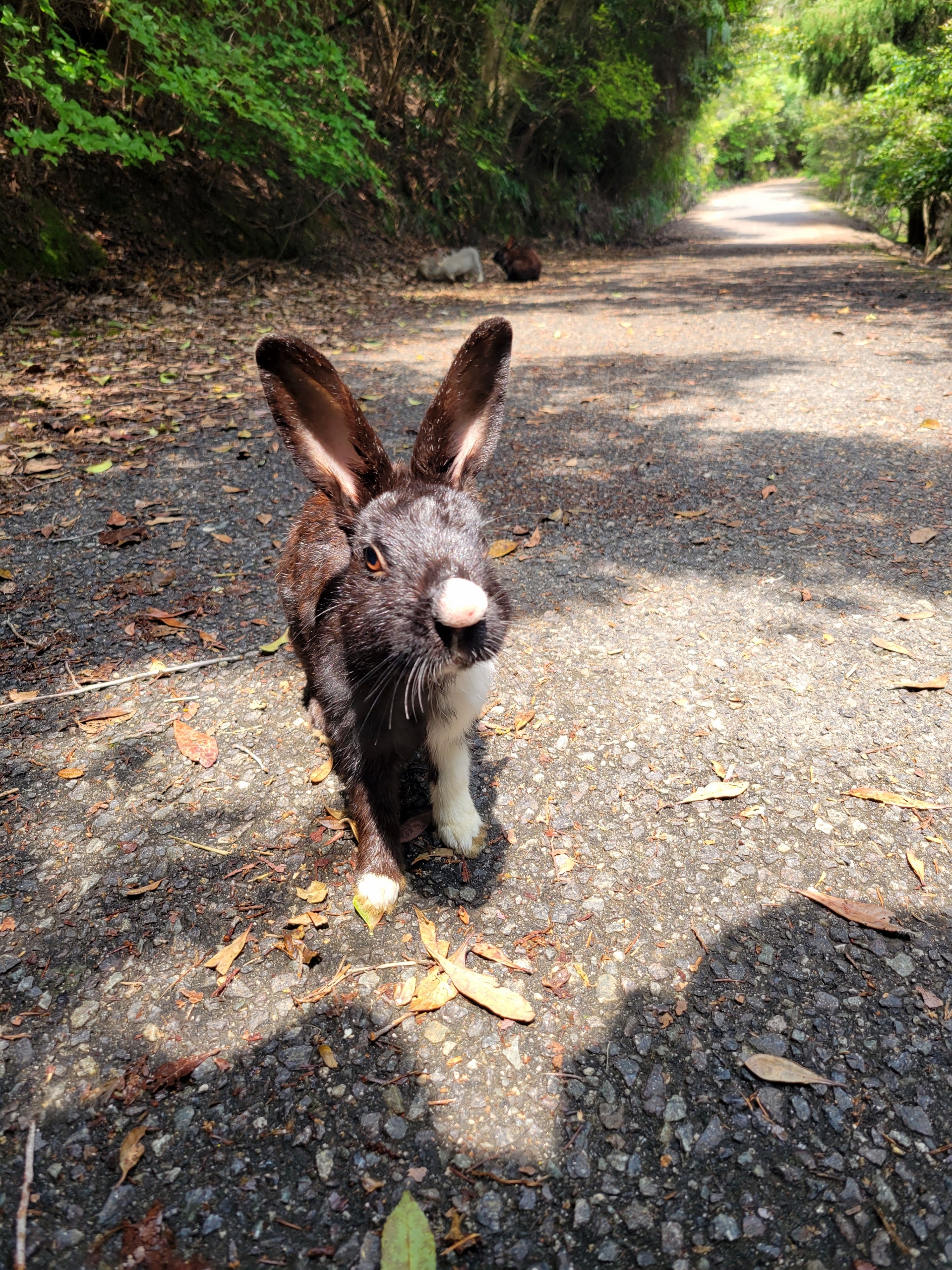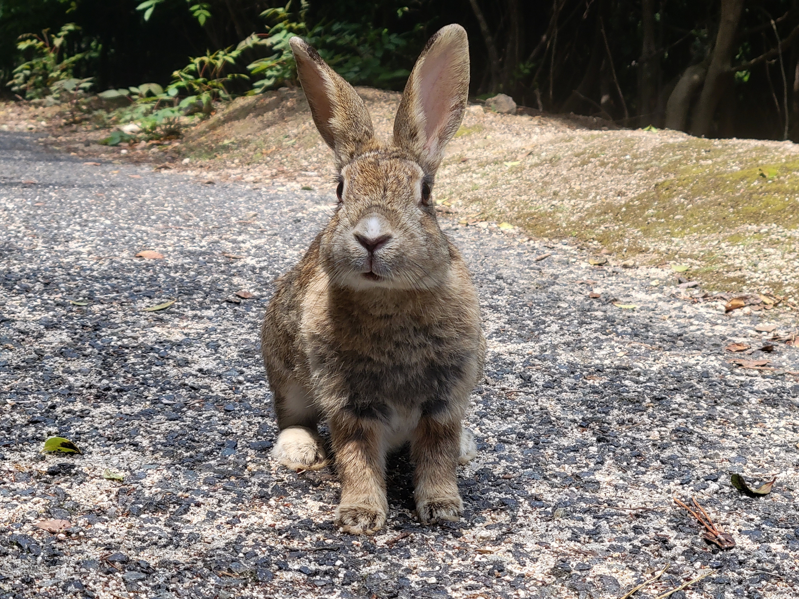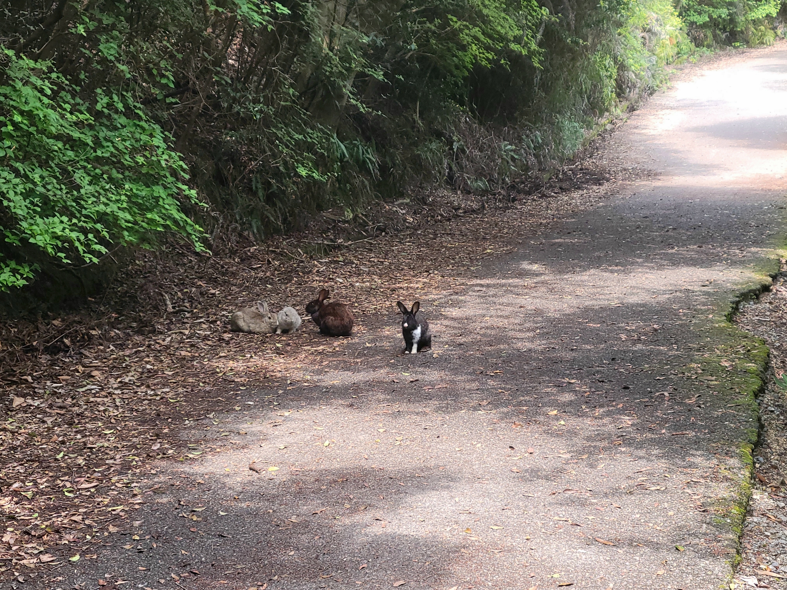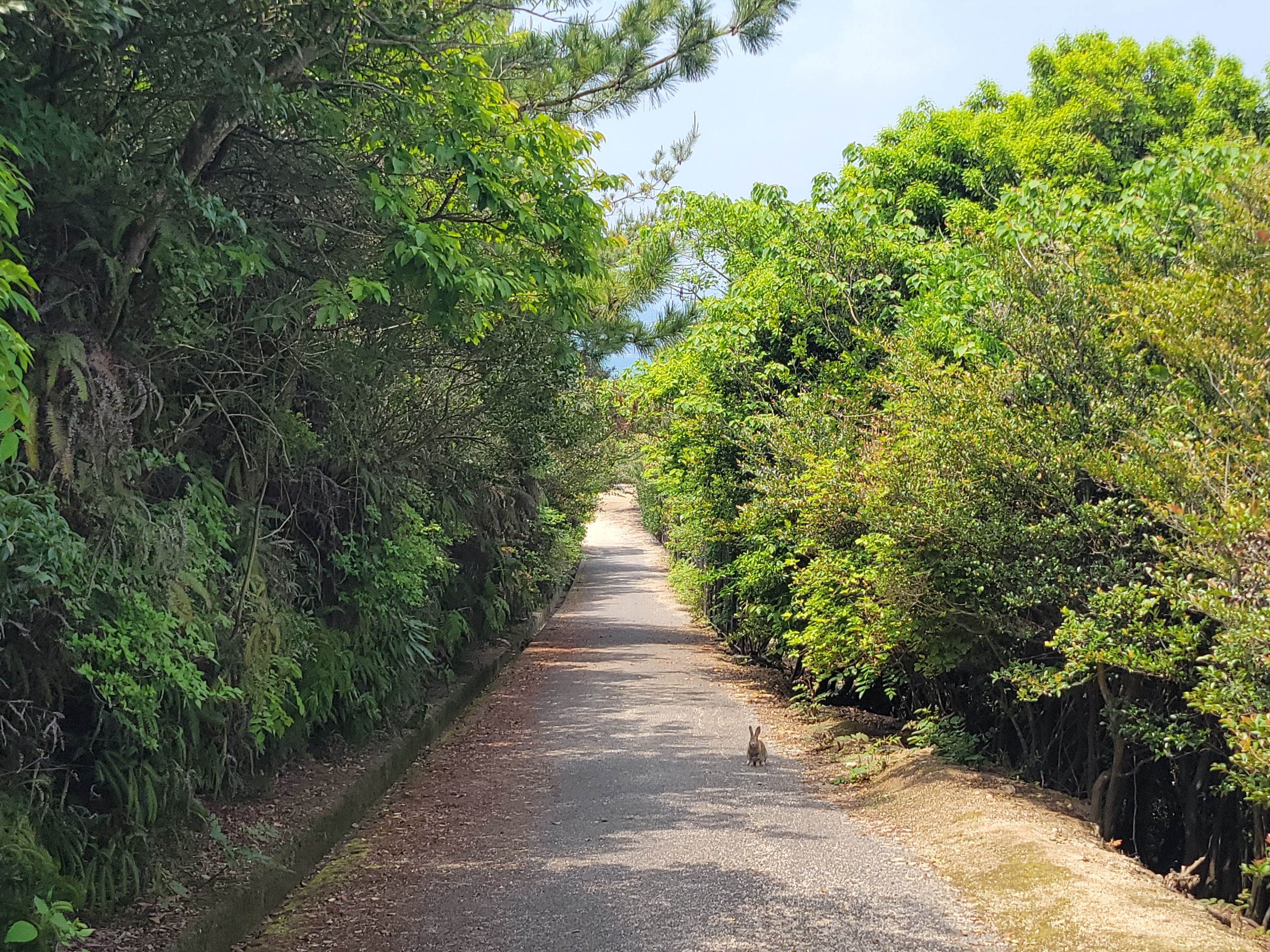 発電所跡を出て再び反時計回りに進むと、上り坂に差し掛かりました。歩いている人もほとんど見かけず、『うさぎの島』というわりには少ないのかな、と思っていた矢先、最初のうさぎに遭遇!