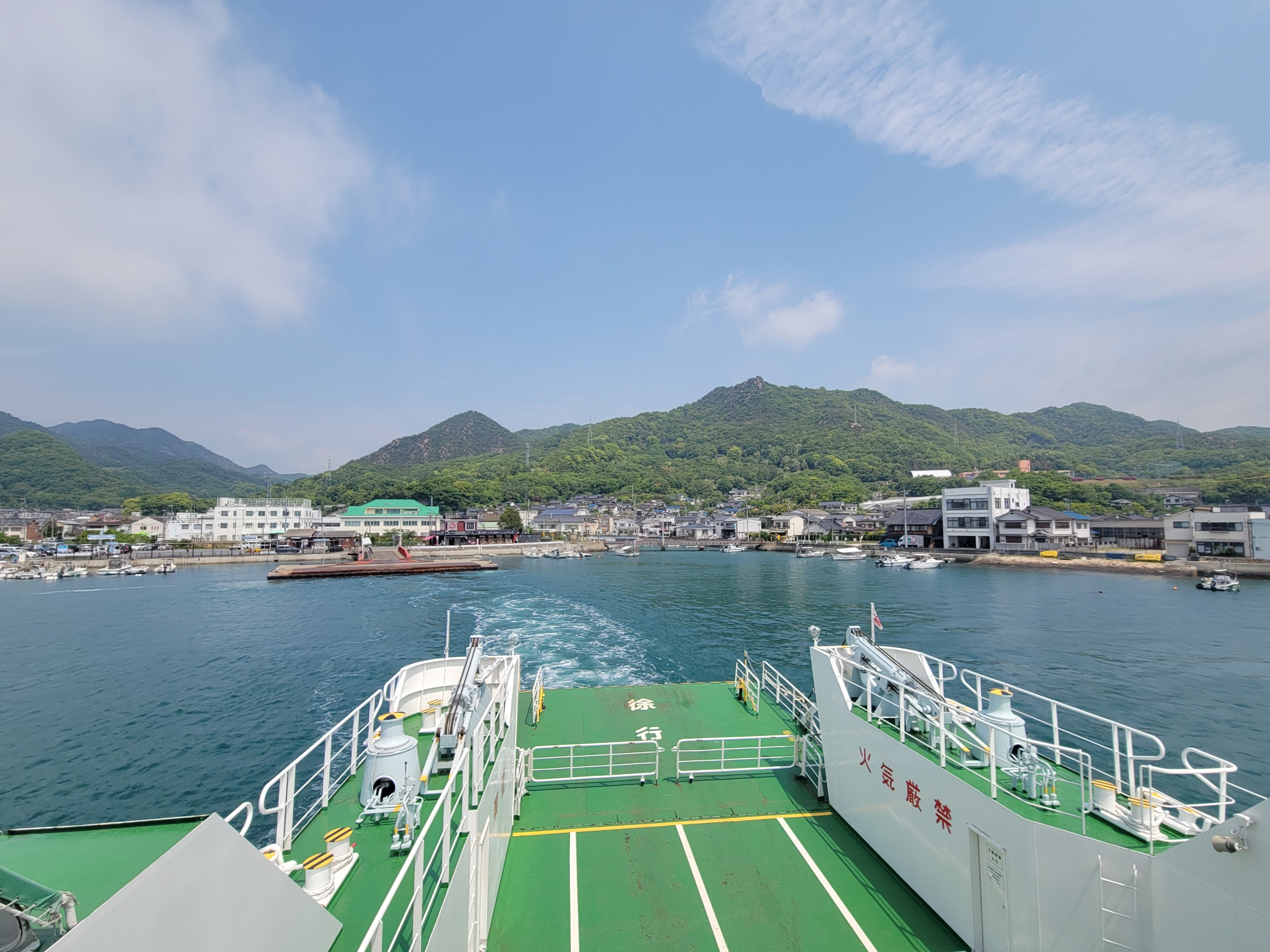 今回の船旅は、フェリーを選びました。このフェリーは、大久野島を往復するだけの旅客船とは異なり、大久野島を経由して大三島の盛港まで行きます。大三島はしまなみ海道の途中の島なので、サイクリング中にちょっと大久野島へ寄り道する、なんてことも可能です。また、週末には三原港からも高速船が運航しているので、より多彩なルートで大久野島へアクセスできます。
