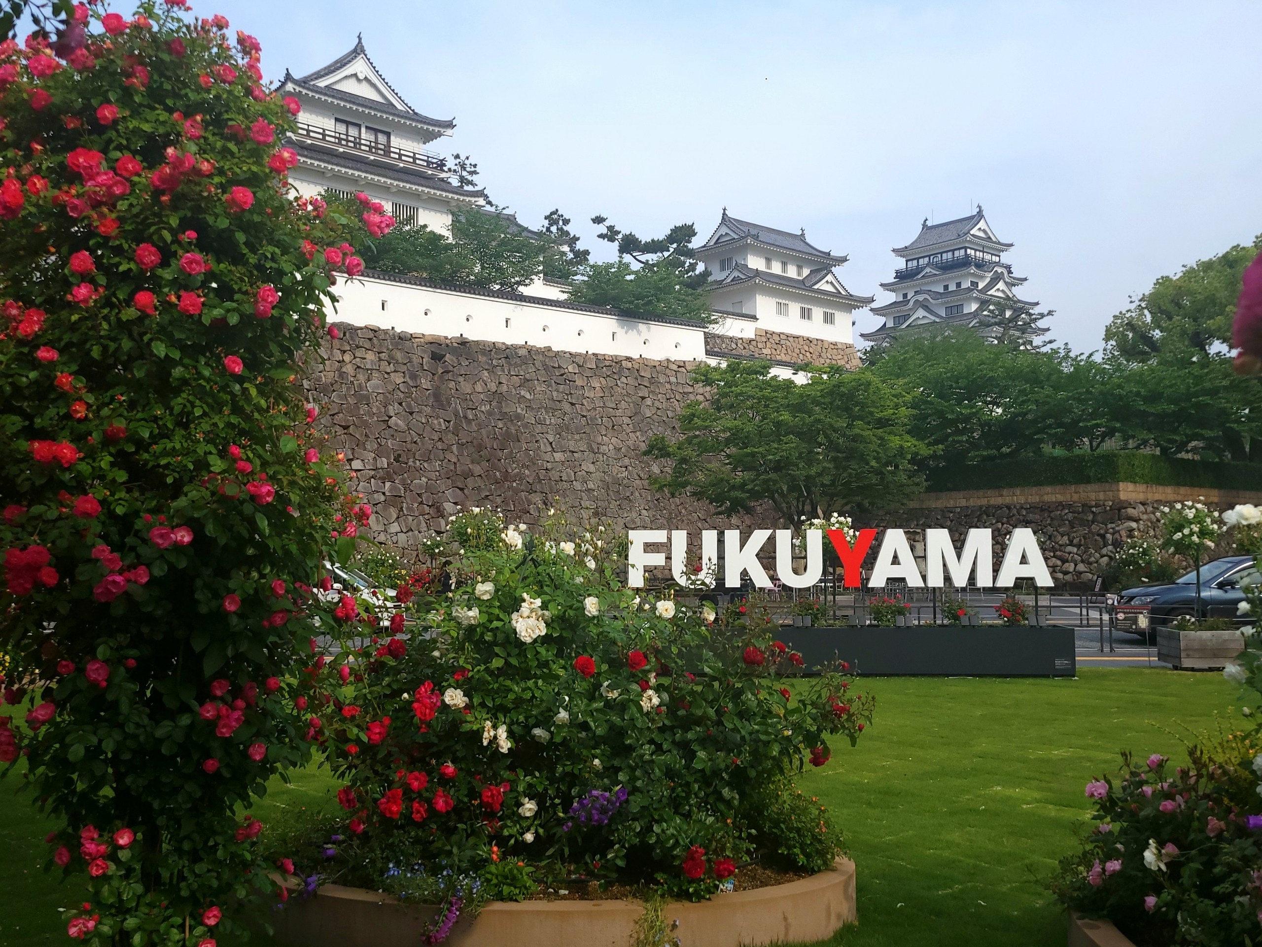 「福山駅北口の『ばら花壇』にはバラが華やかに咲き誇っていました。ぜんぜん知らなかったのですが、福山市は『バラのまち』として有名だそうで、毎年5月には100万本のバラが咲き乱れる『福山ばら祭り』が開催されているとのことです。今年はさらに、『第20回世界バラ会議福山大会2025』が今週末の5月18日(日)から24日(土)にかけて開催されるとのことで、街全体がバラ一色に染まっています。