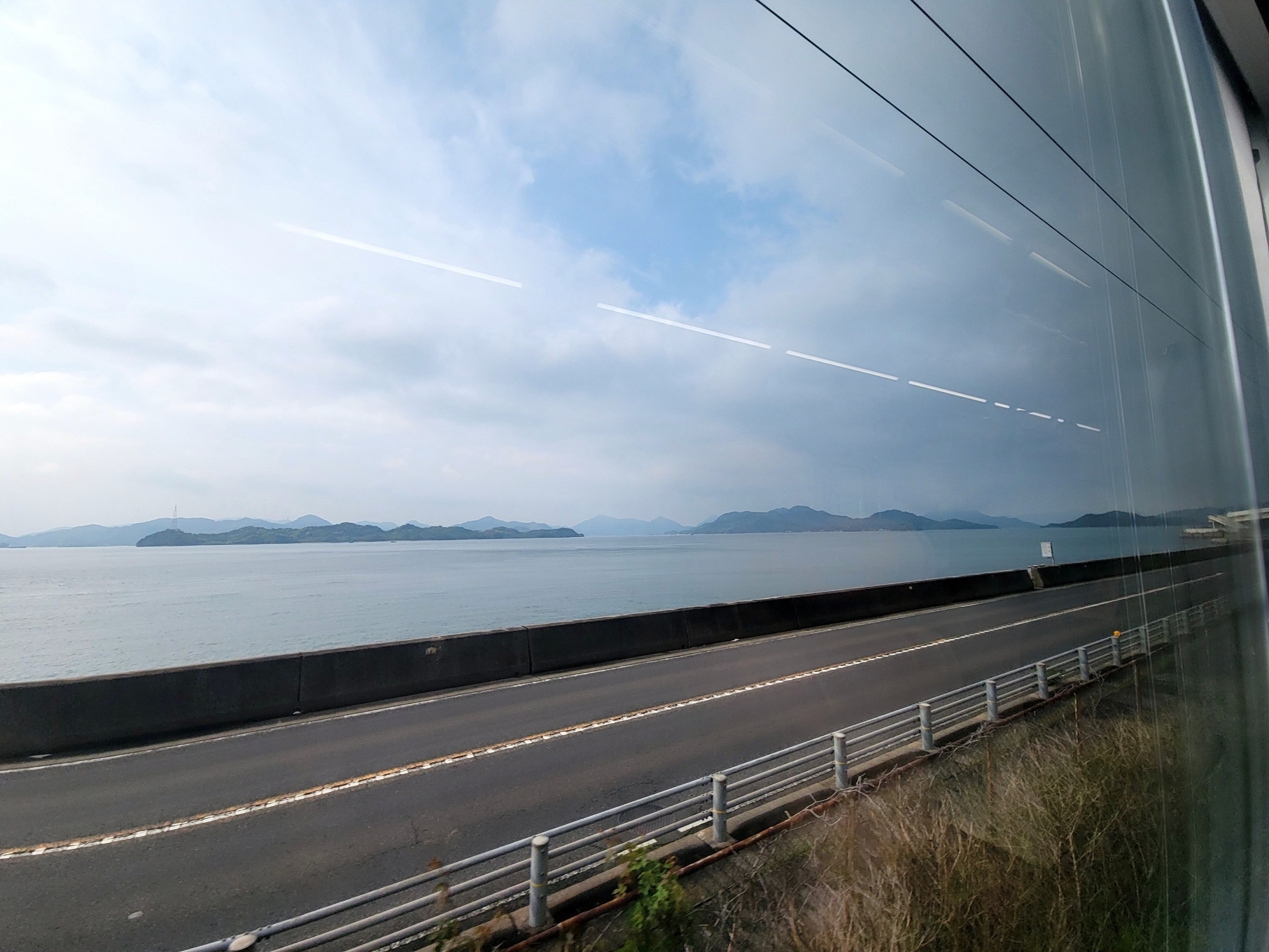 竹原駅から次の大乗駅までは、JR呉線の線路が山あいを進むのに対し、代行バスは海沿いの国道185号線を通りました。そのため、海の景色を間近に楽しめるという、鉄道では味わえない特別な体験ができました。代行バスなので駅周辺にしか停まらず、スムーズに移動できたのも良かったです。