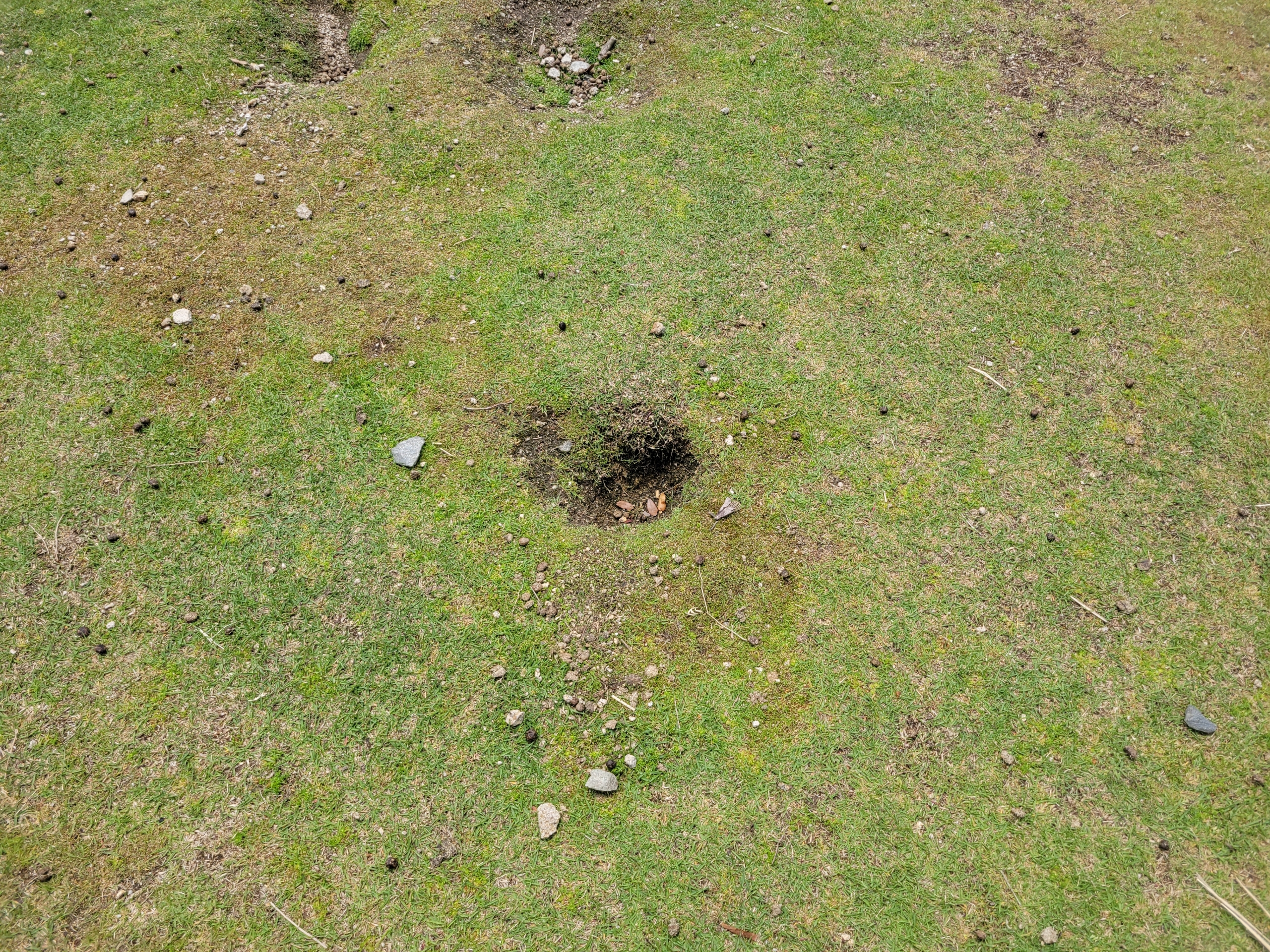 休暇村の前の広々とした芝生には、いたるところにデコボコが見られますが、これはどうやらうさぎたちが作った穴のようです。穴の周辺に糞が落ちています。