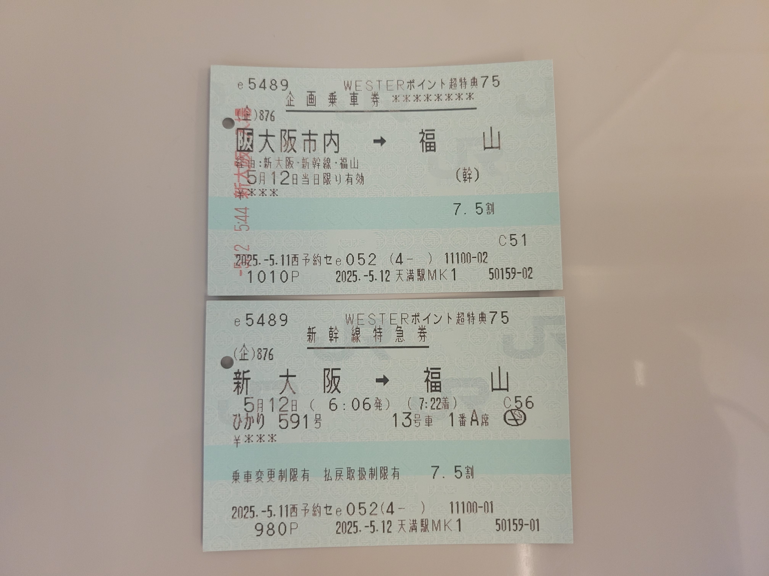 今回は、JR西日本のWESTER POINTを利用した『超特典きっぷ』を活用しました。このきっぷは、山陽新幹線全線で利用でき、なんと定価から75%オフになるという破格の割引率が魅力です。以前よりも割引率や利用区間の柔軟性が増し、格段に使いやすくなっています。今回の企画は6月末まで。