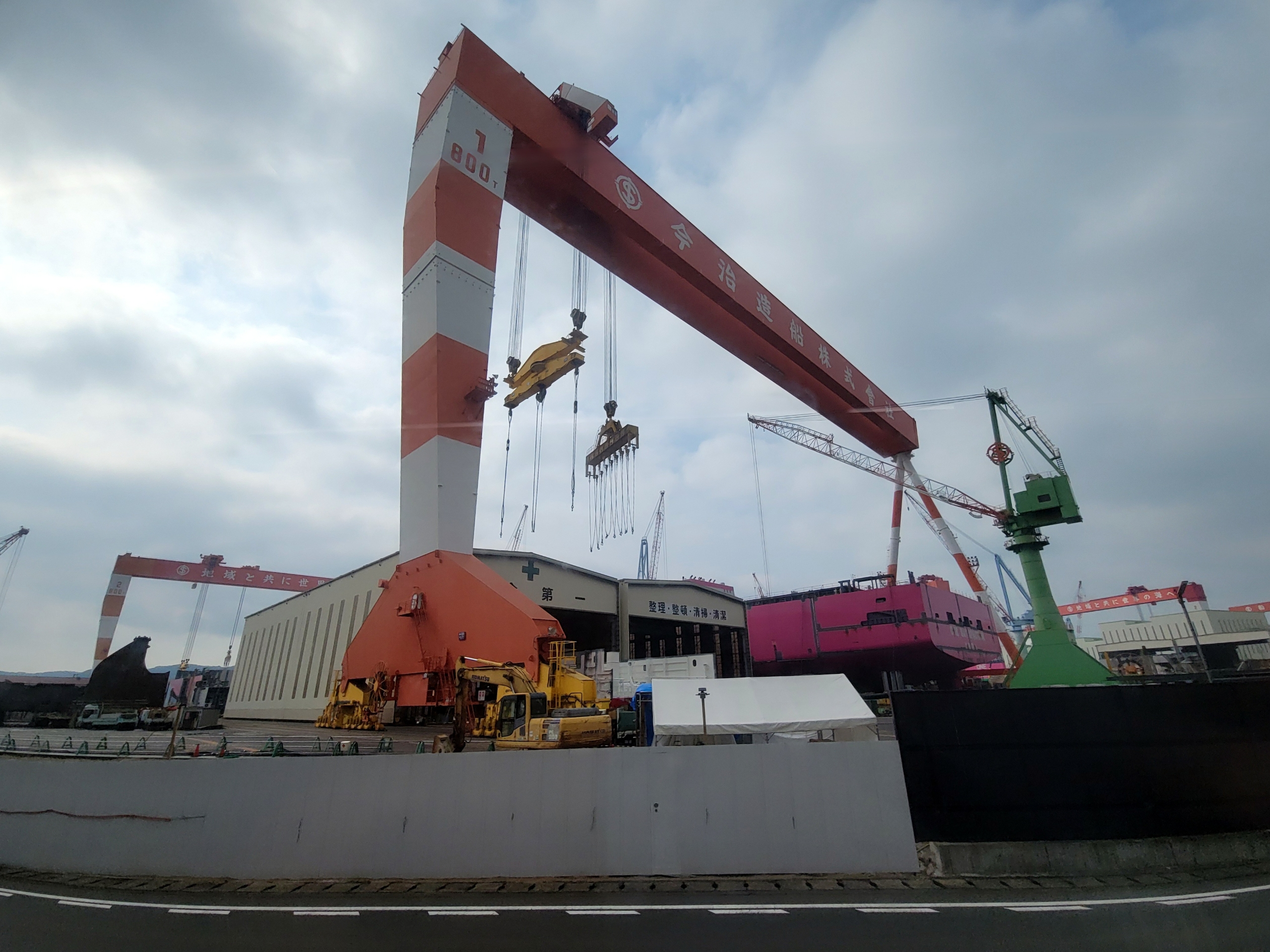 安芸幸崎駅のあたりでは、巨大な造船工場を間近に見ることができます。まるで窓に張り付いて見上げるほど大きなクレーンが何本もそびえ立ち、建造中の船の巨大さを肌で感じられます。