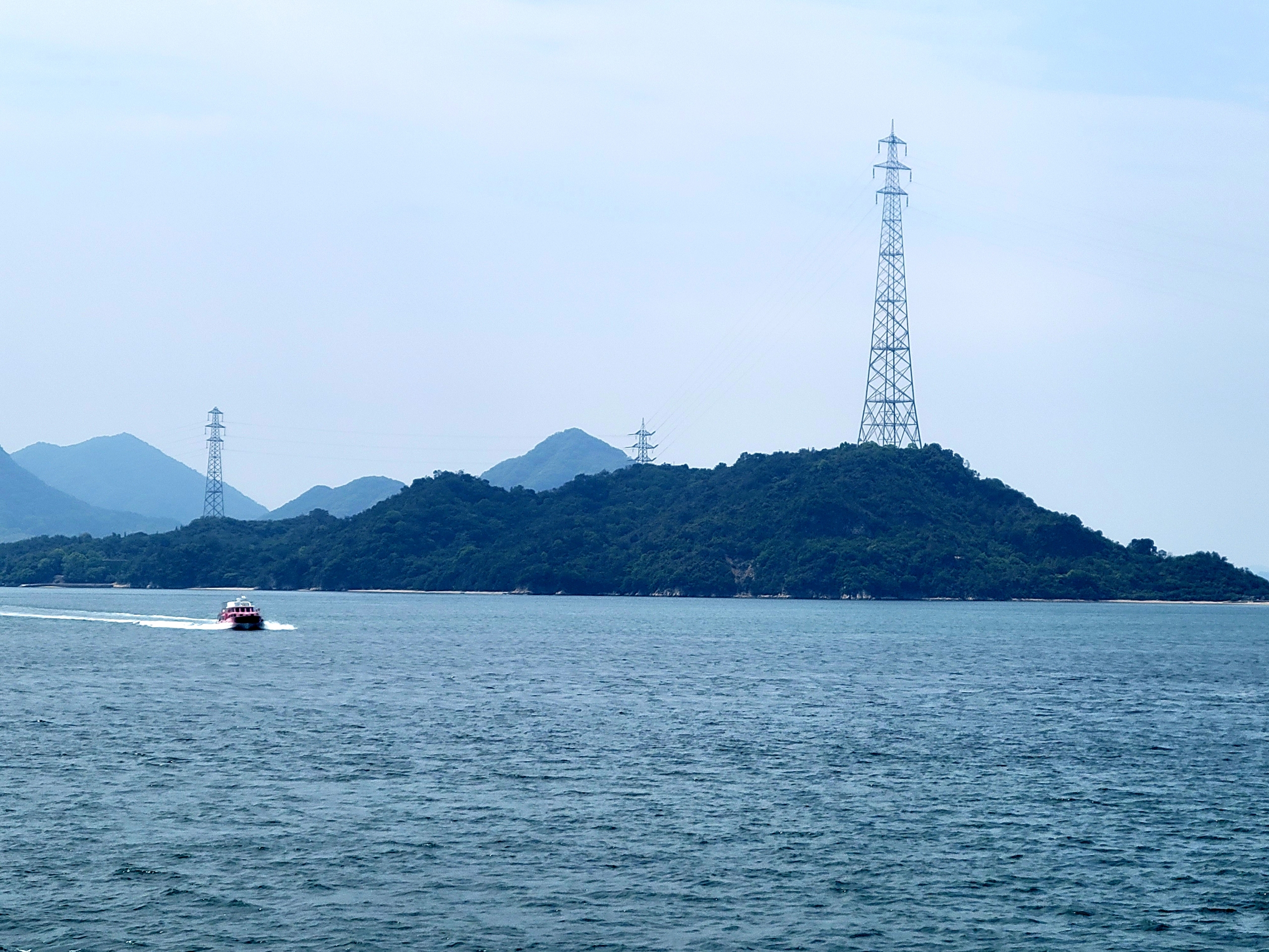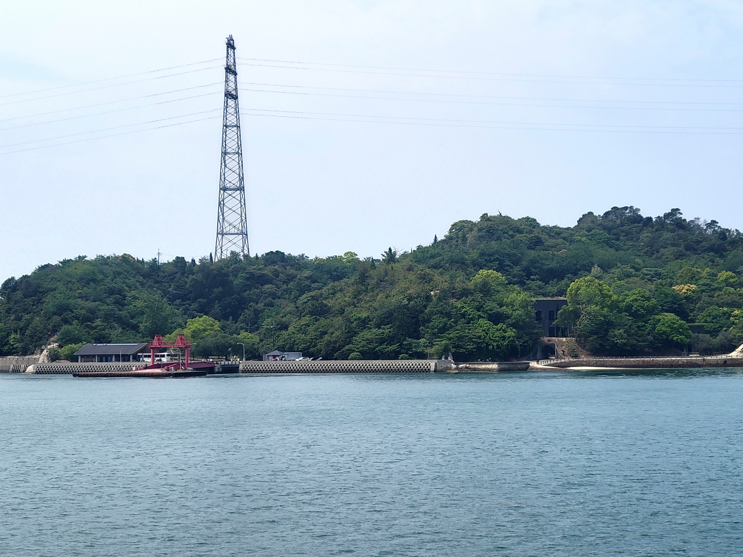 フェリーの乗客から、『あの大久野島の鉄塔、日本一高いらしいよ』という声が聞こえてきました。半信半疑で後から調べてみたところ、本当にその通りで、高さ226mを誇る日本一高い送電鉄塔であることが分かり、驚きです。この巨大な鉄塔は、中国電力ネットワークの大三島支線として、忠海から大三島まで、大久野島を経由して海上を送電線で結んでいます。