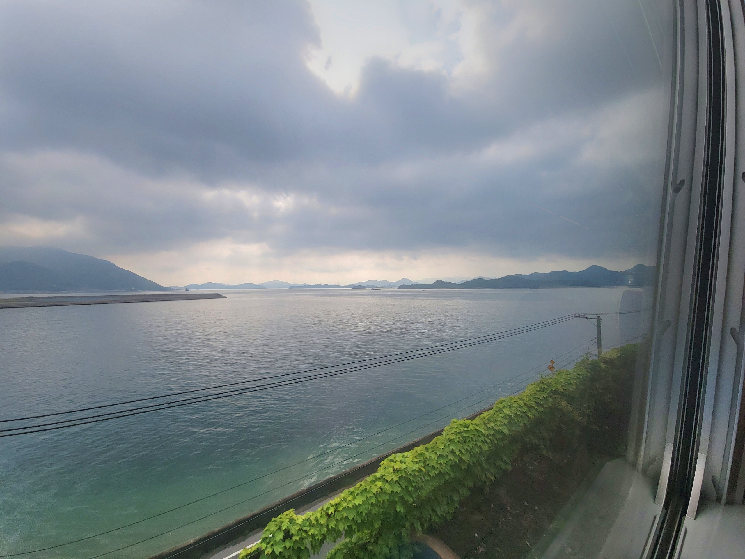 呉線は、三原駅から瀬戸内海沿いを通り、広島駅の3駅手前にある海田市駅までを結ぶ路線です。車では通ったことがありましたが、鉄道で走るのは今回が初めて。週末には観光列車も走るという、海沿いの眺めが特に良い路線だと聞いていたので、三原駅を出発してすぐに、期待通り瀬戸内海の素晴らしい景色が目の前に広がりました。