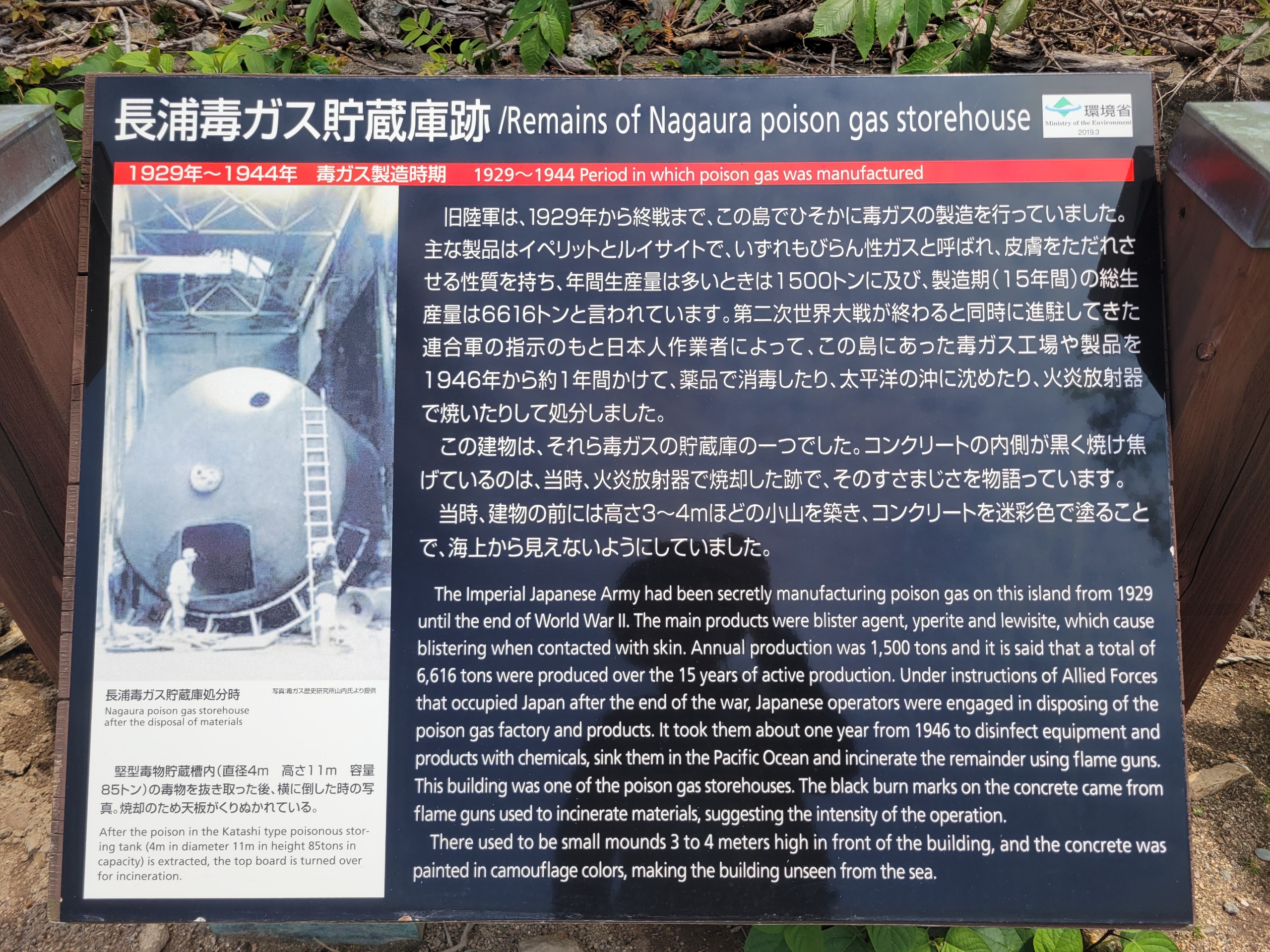 旧陸軍は、1929年から終戦まで、この島でひそかに毒ガスの製造を行っていました。 主な製品はイペリットとルイサイトで、いずれもびらん性ガスと呼ばれ、皮膚をただれさせる性質を持ち、年間生産量は多いときは1500トンに及び、製造期(15年間)の総生産量は6616トンと言われています。第二次世界大戦が終わると同時に進駐してきた連合軍の指示のもと日本人作業者によって、この島にあった毒ガス工場や製品を 1946年から約1年間かけて、薬品で消毒したり、太平洋の沖に沈めたり、火炎放射器で焼いたりして処分しました。