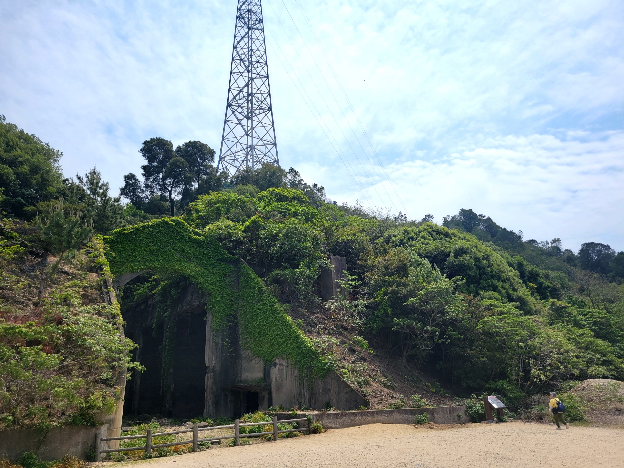 長浦毒ガス貯蔵庫跡からは、平坦でよく整備された遊歩道が続いています。歩きやすい道の脇には、平らなグラウンドのような場所やテニスコートが多く見られますが、実はこのあたりも、元々は毒ガス工場関連の施設があった跡地だそうです。ここは、旧日本陸軍が秘密裏に進めていた毒ガス製造工場の中枢であり、島の軍事活動を陰で支える心臓部でした。一見すると開放的な空間ですが、その地下や過去には、毒ガス製造という重い歴史が隠されていることを感じさせます。