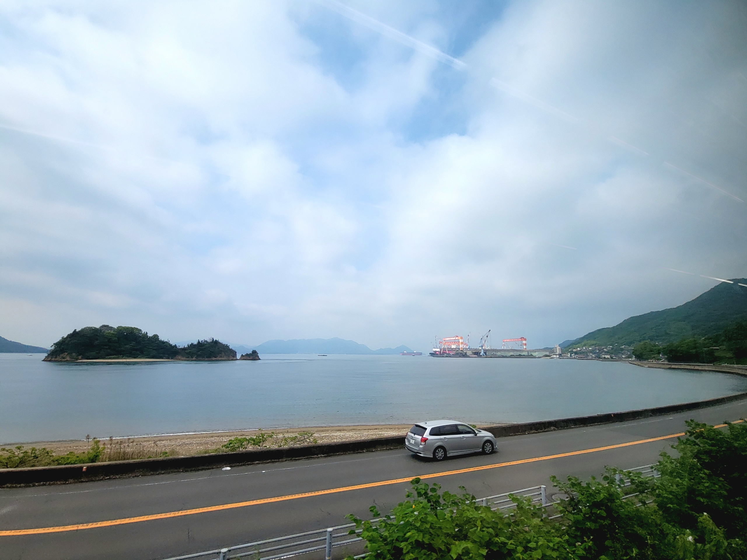 須波駅から安芸幸崎駅にかけても、引き続き素晴らしい海の景色が広がっていました。特に目を引いたのが、左手に見える有竜島(うりゅうじま)です。まるで海に浮かぶクジラのように見えませんか? 電車と並行して走る国道185号線も、この区間では海沿いを通っていて、心地よいドライブができそうだと感じました。