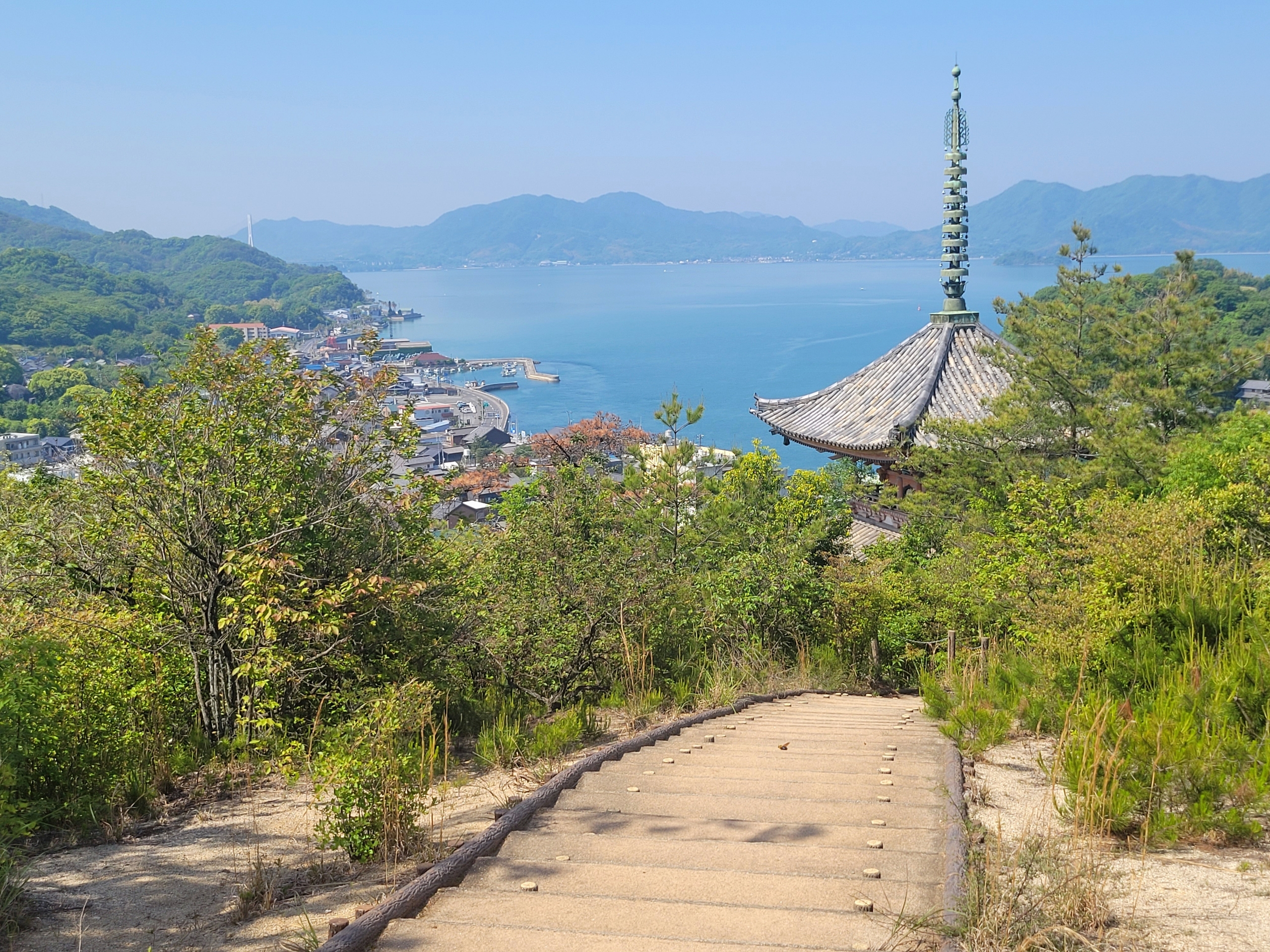三重塔の屋根と瀬戸田の街並み、そしてその先に広がる瀬戸内海と島々が織りなす景色は、まさに絵画のようでした。この組み合わせは、本当に絵になりますね。