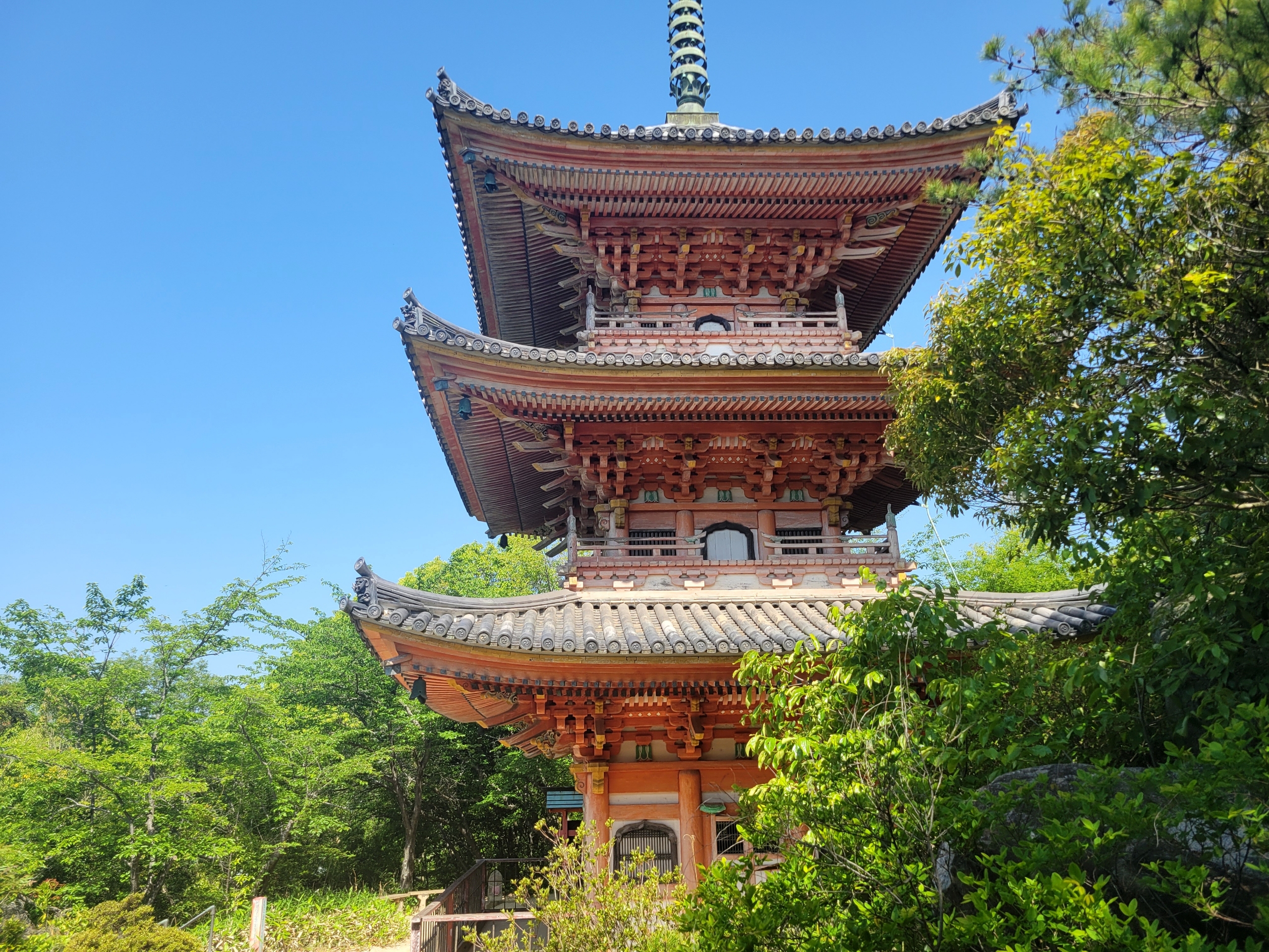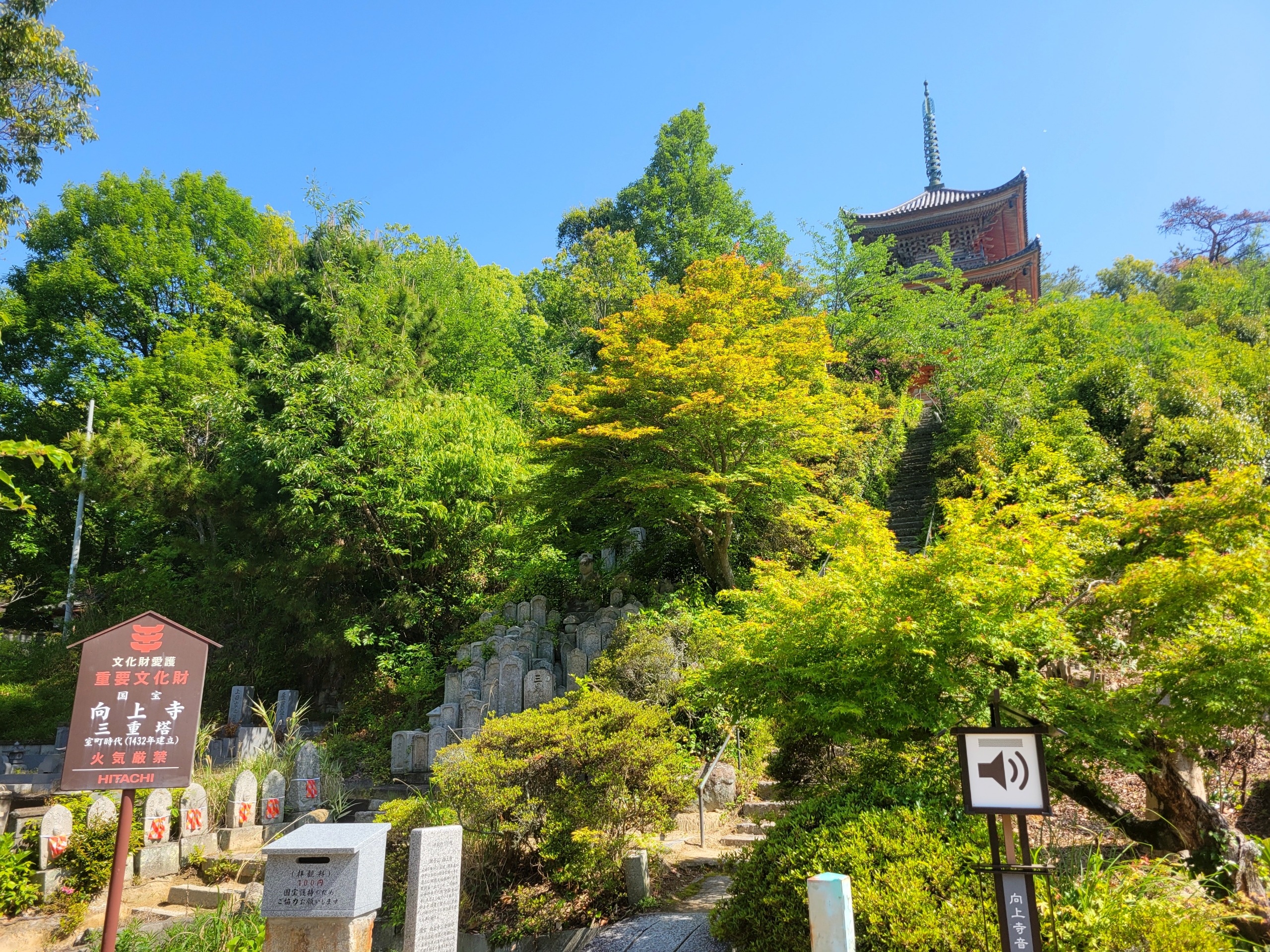 向上寺に立つ三重塔は、高さは約23メートル。朱色の塔は、新緑の木々の中に堂々とそびえ立ち、歴史と自然が見事に調和した景観を作り出しています。