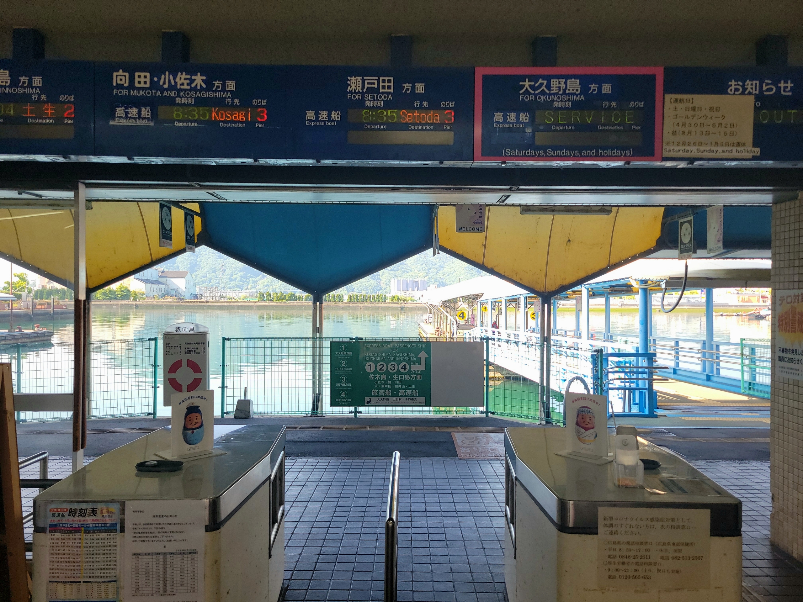 瀬戸田行きは8時45分発だと思っていましたが、改札の表示には10分早い8時35分と表示されていました。どうやら三原~瀬戸田間は2社が運航しているようで、迷わず早い便に乗船することにしました。これだけ便数があるということは、やはり需要もかなり高いのでしょうね。ほかに因島方面への航路も運行されていますが、そちらは広島ワイドパスの対象外です。