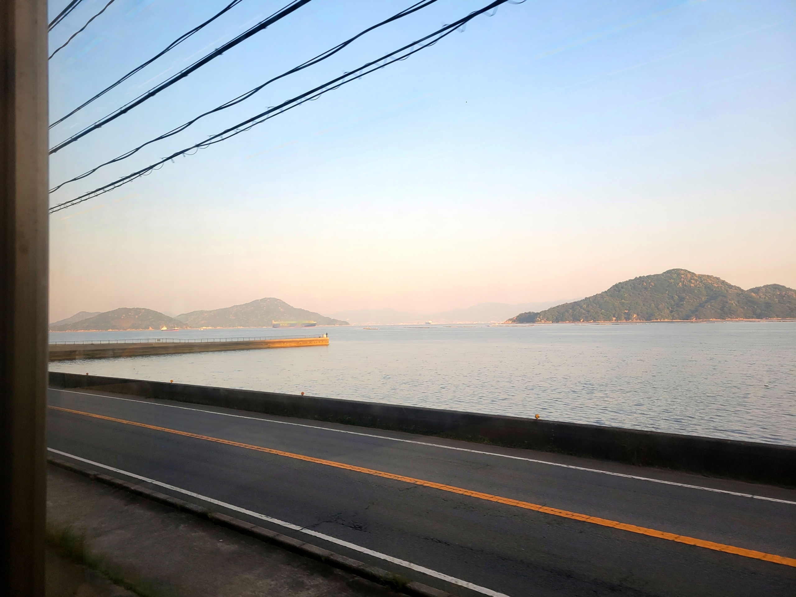 水尻駅付近からかるが浜駅にかけて、列車は海沿いを走ります。穏やかな朝焼けの空の下、波静かな広島湾を眺めながら進む車窓は、本当に心地よい時間でした。やわらかな朝の光が、あたりを優しく包み込んでいます。