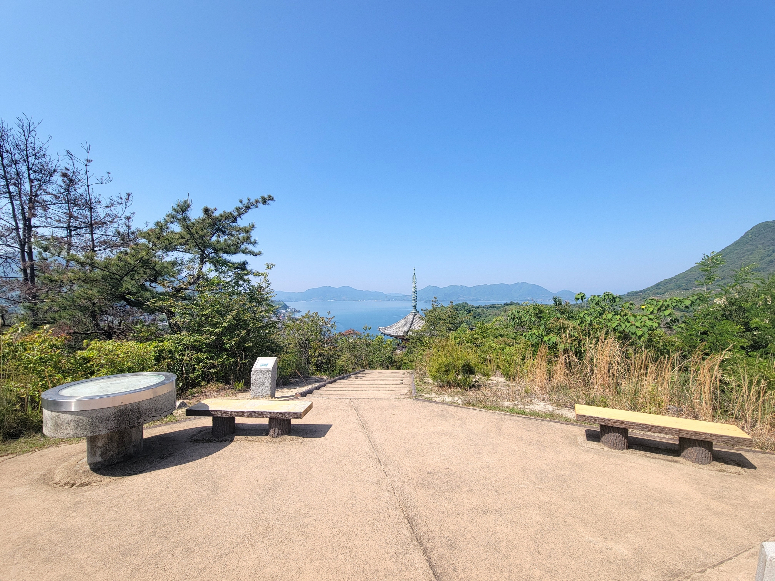 向上寺の三重塔の裏手にある潮音山公園へ到着しました。残念ながら、視界が開けていたのは瀬戸田の街がある南西方面だけでした。もう少し広範囲の景色を期待していたのですが…。