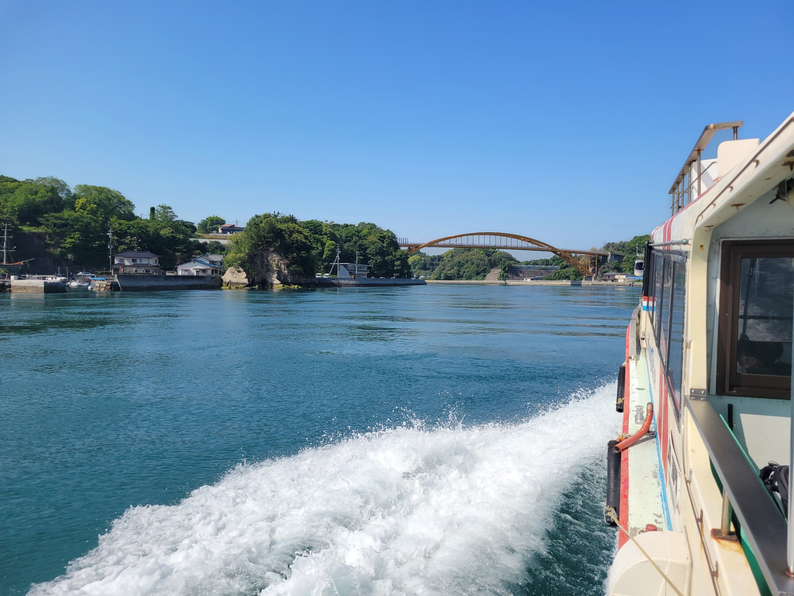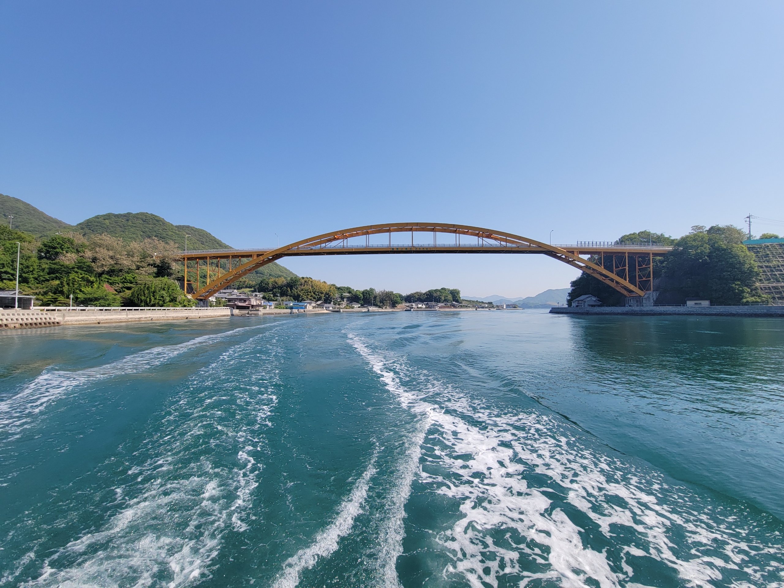 船は、生口島と高根島を結ぶ高根大橋の真下をくぐります。1989年に開通したこの橋は、中央径間が比較的短い、美しいアーチ橋として知られています。その橋桁下の高さは約23メートルとされており、瀬戸田水道を航行する船舶が安全に通行できるよう設計されています。瀬戸内海の多島美の中で、鮮やかな黄色のアーチが景色に彩りを添え、魅力的なアクセントとなっています。
