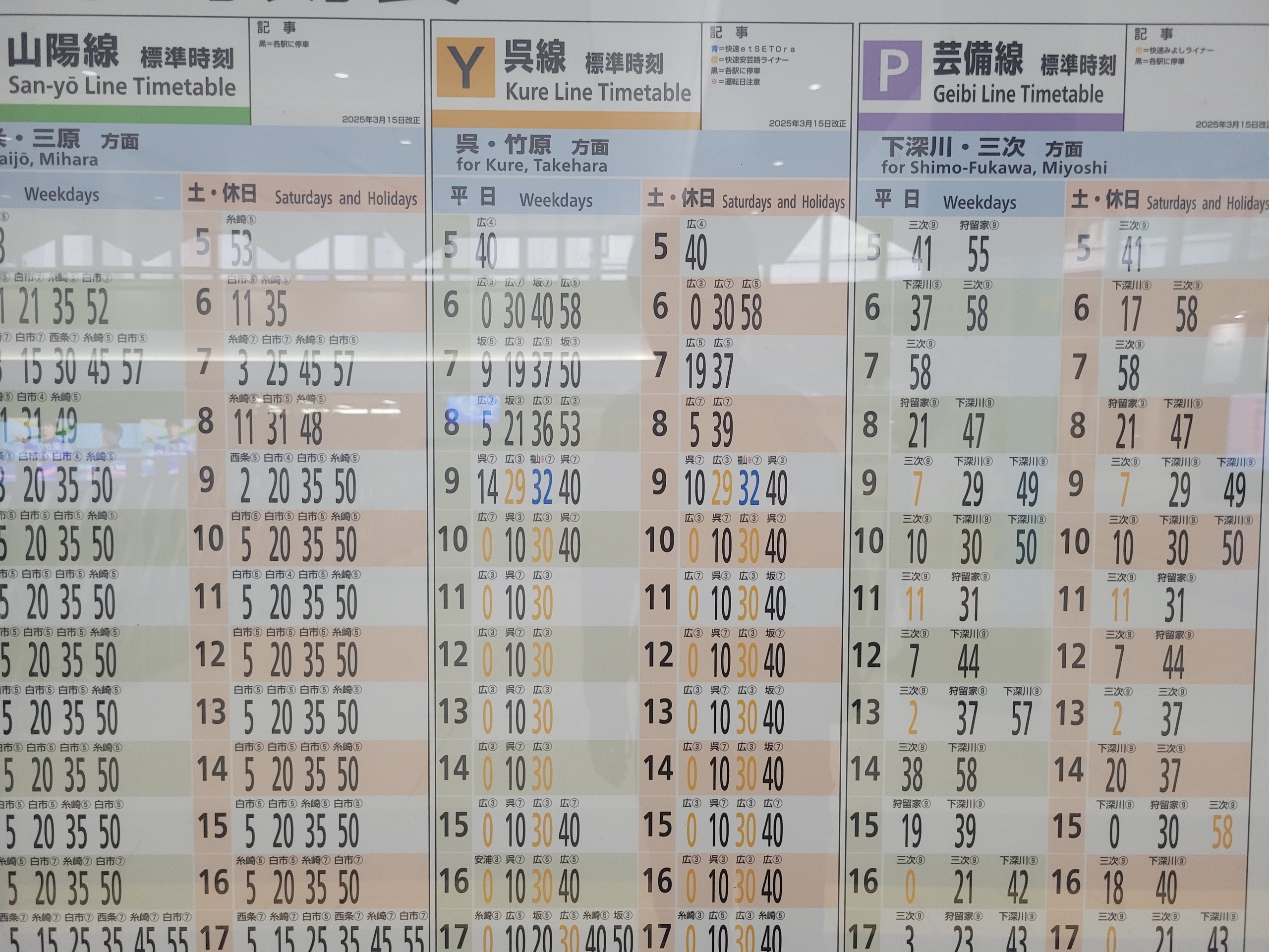 改札横で時間つぶしに時刻表を見ていると、呉線の平日と週末のダイヤがかなり違うことに気づきました。特筆すべきは、休日の昼間が3~4本に増えることでしょうか。反対に、休日の朝はほぼ半減しています。これは、呉線を利用して広島方面へ買い物に出かける人が多いことの表れかもしれませんね。