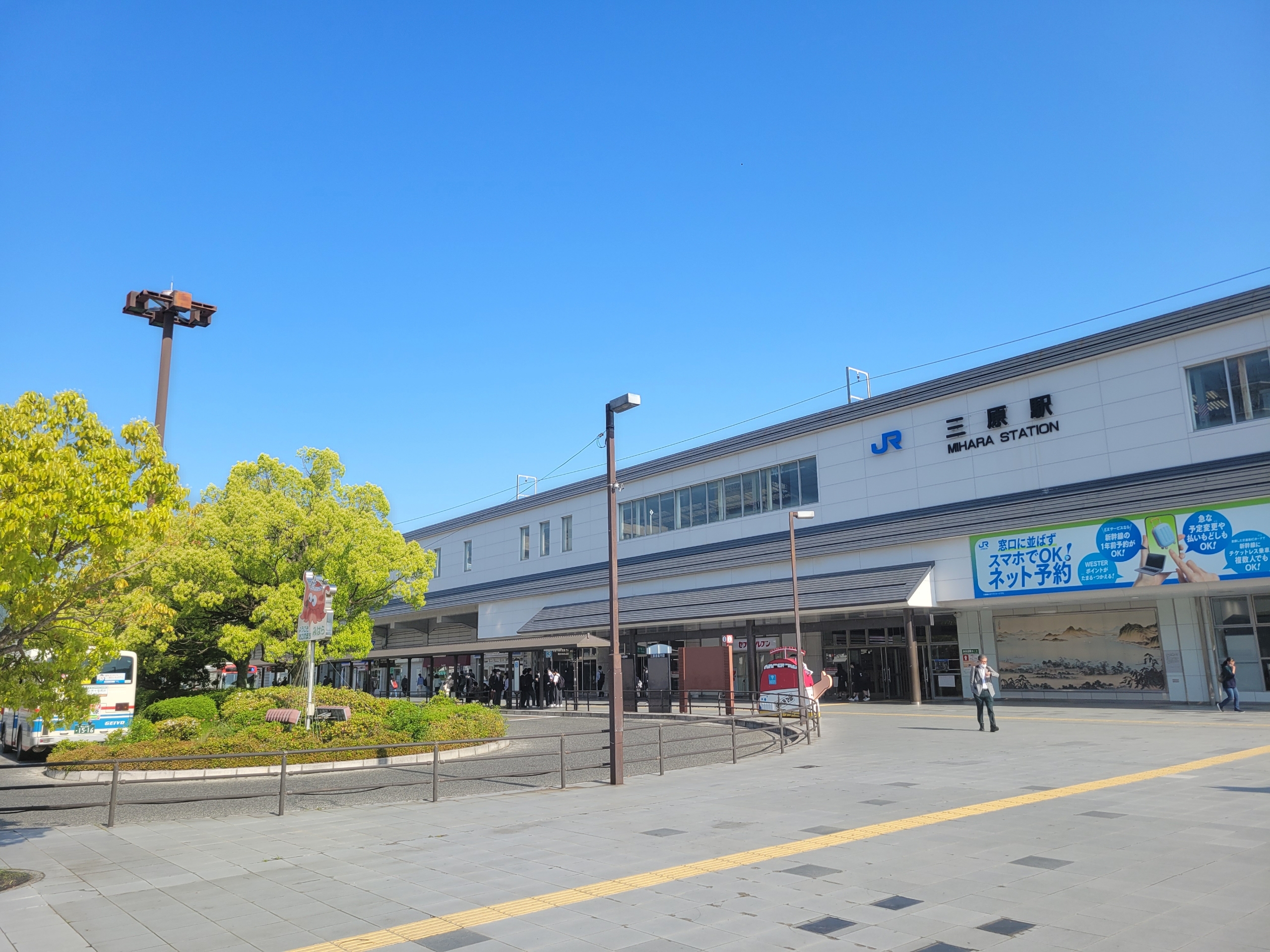 新幹線も停車する三原駅は、1990年の在来線高架化によって、近代的なターミナル駅へとその様相を一新しました。白を基調としたモダンな駅舎と、光を強く反射する地面のタイルが組み合わされ、駅周辺は常にまばゆいほどの明るさに満ちています。