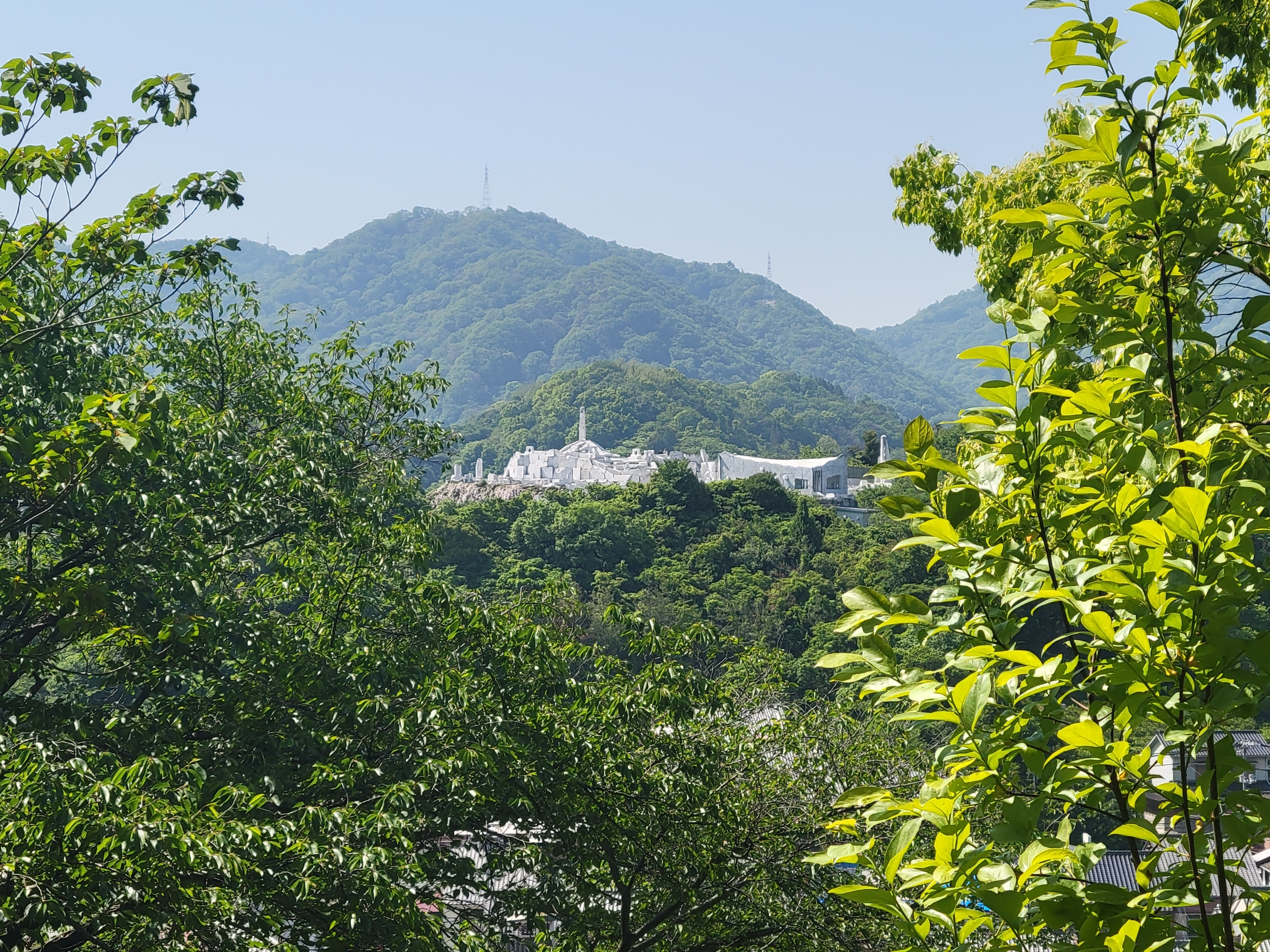 下山ルートからは、耕三寺にある真っ白な「未来心の丘(みらいしんのおか)」が見えてきました。SNSでよく見かける「映えスポット」として、最近特に注目されていますね。耕三寺は、その独創的なコンセプトと壮大なスケールから、もはや単なる宗教施設という枠を超え、現代の観光客が求める「映え」を意識したユニークな寺院としてテーマパーク的な要素が強いですね。