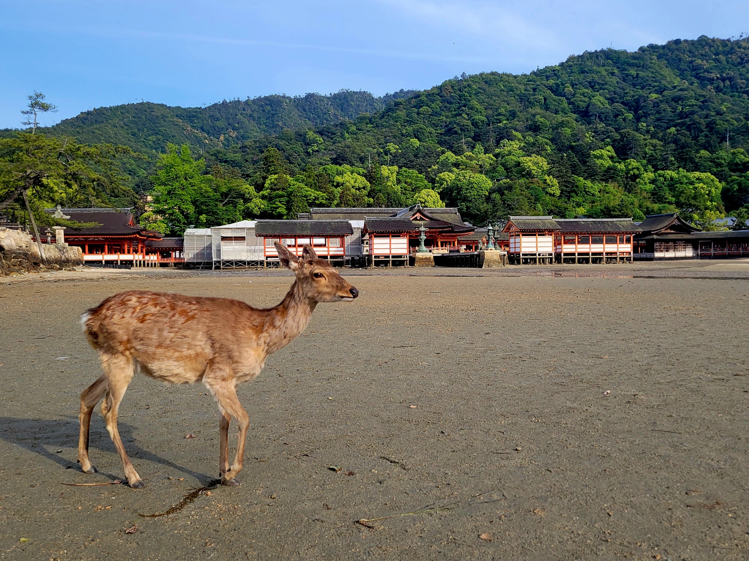 宮島では、約500島の鹿が生息していて、自由に歩き回る姿をよく目にします。大鳥居と鹿を一緒に写真に収めたいと思うのですが、これがなかなか難しい。鹿は、餌を持っていそうな観光客めがけて近づいてくるのですが、実は鹿への餌やりは1998年に禁止され、2007年からは鹿せんべいの販売も中止されています。それでも鹿が人に寄ってくるということは、残念ながらいまだに誰かが餌を与えているのでしょう。宮島の鹿たちは基本的に空腹状態のようで、食べ物が入ってそうな観光客のカバンをかじったり、あさったりする姿が散見されました。