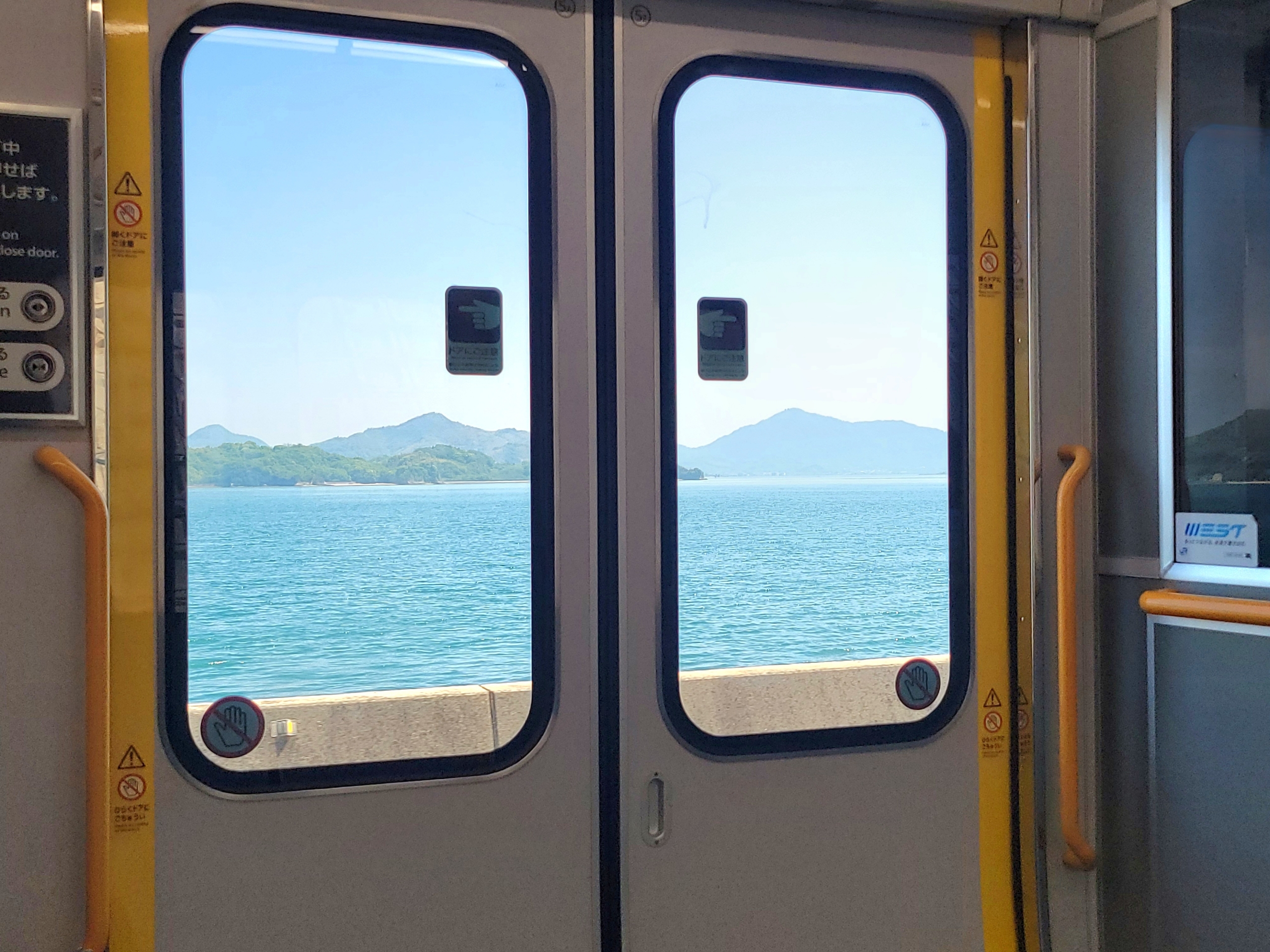 糸崎駅では、ホームの前方にある乗り換え階段に合わせて車両が停車するため、次の広島方面行きの列車は、前方の車両ほど混雑します。少し失敗したなあとは思いつつも、私は先頭車両の補助シートに座り、エアコンの効いた車内で一息つきながら、窓の外に広がる海を眺めました。