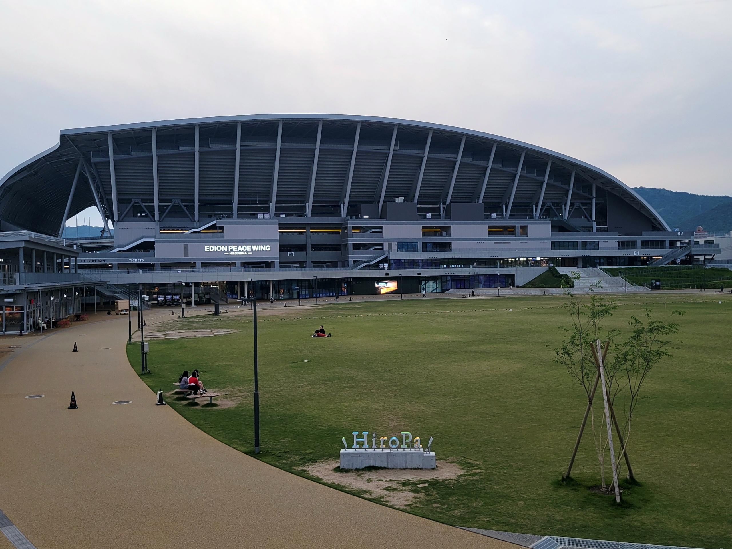 スタジアム前には、「HiroPa(ヒロパ)」と名付けられた広大な芝生広場が広がっています。その周囲にはショップやレストランが軒を連ね、試合開催日以外でも人々が訪れるように整備されているのですが、私が訪れた日は試合のない平日だったためか、かなり静かで、集客には苦戦しているようでした。