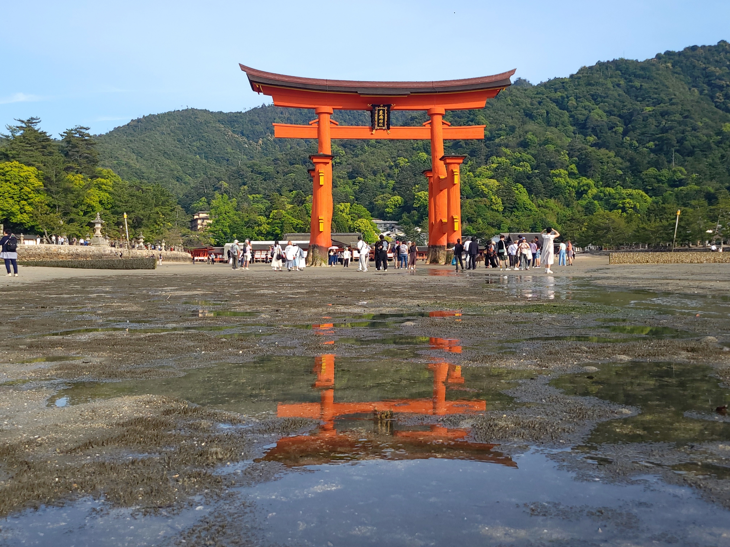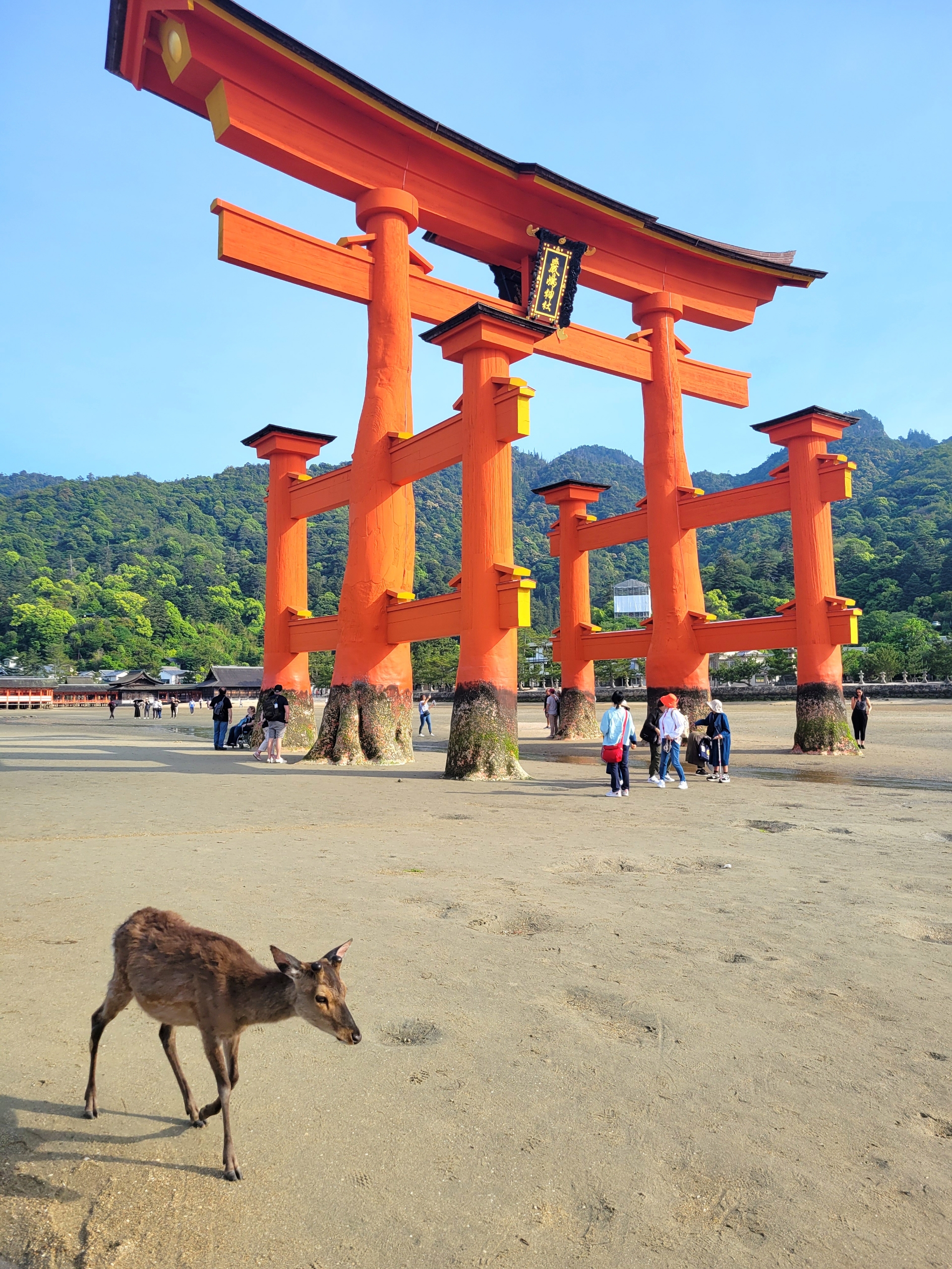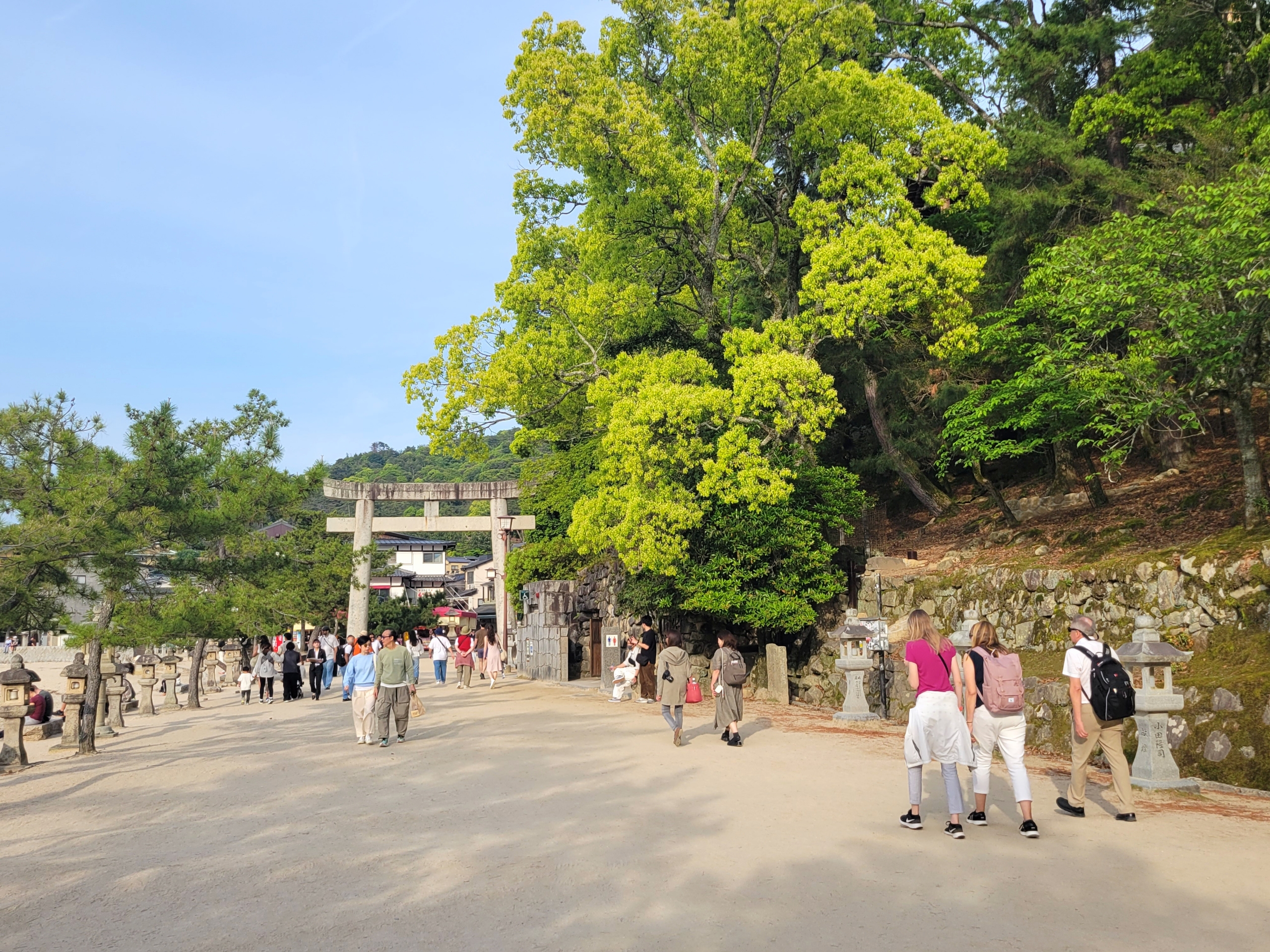 厳島神社の大鳥居は、2019年から2022年にかけて70年ぶりの大改修を終え、その真新しい姿と鮮やかな朱色が印象的でした。私はもっと丸みを帯びた柱を想像していたのですが、実際に見てみると、木の形状がそのまま現れた意外とごつごつとした質感に驚かされました。