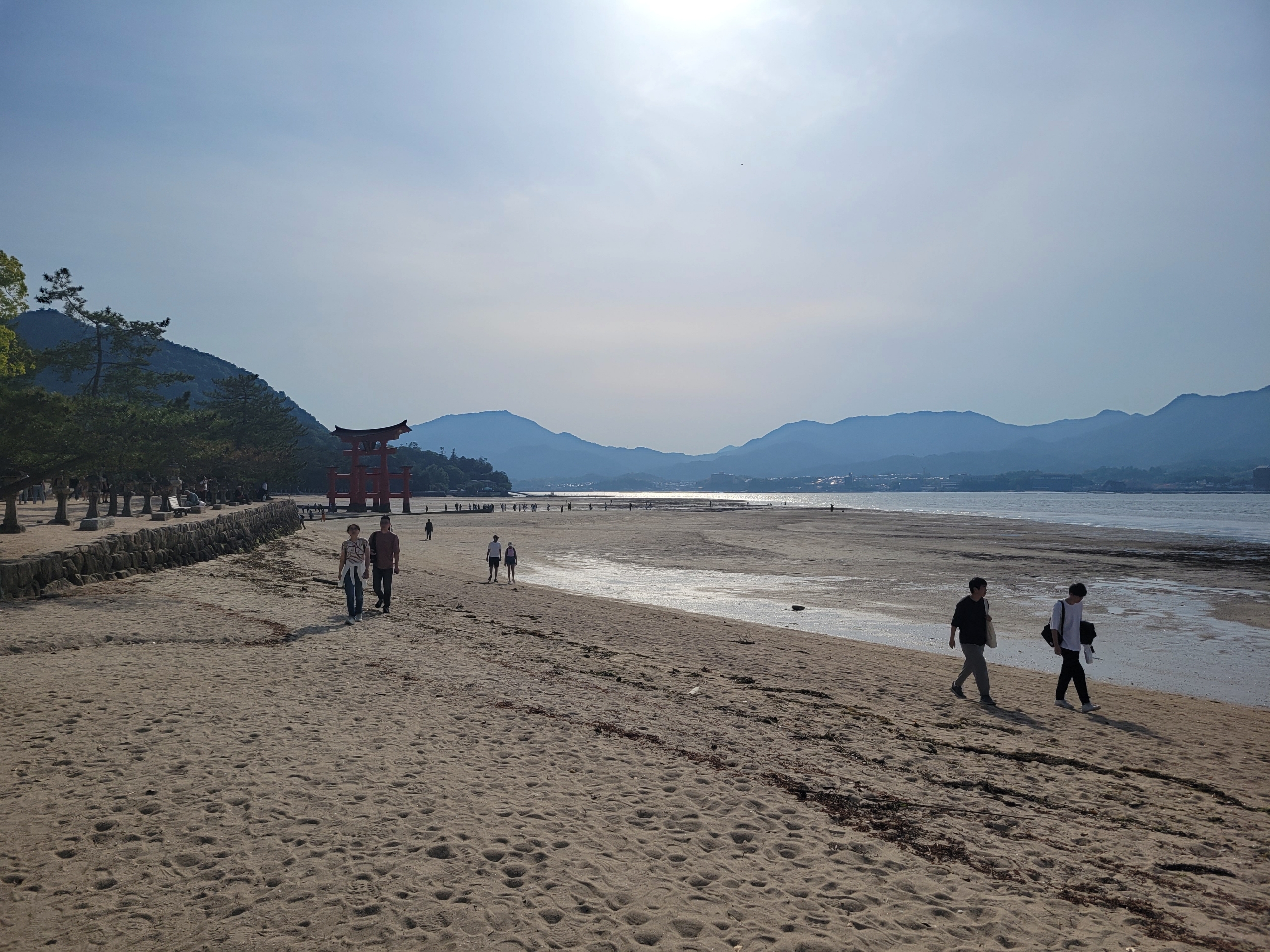 いままでは、海に浮かぶ厳島神社を見たく、満潮に近い時間帯を狙ってきてたので、ここまで潮が引いて砂地が顔を出しているのを始めてみました。この日の潮位は大潮、干潮のピークは現在15時~16時は36cmです。今日の満潮ピークは345cm。その差はなんと3mというから驚きです。瀬戸内海はほんとうに干満の差が大きいです。