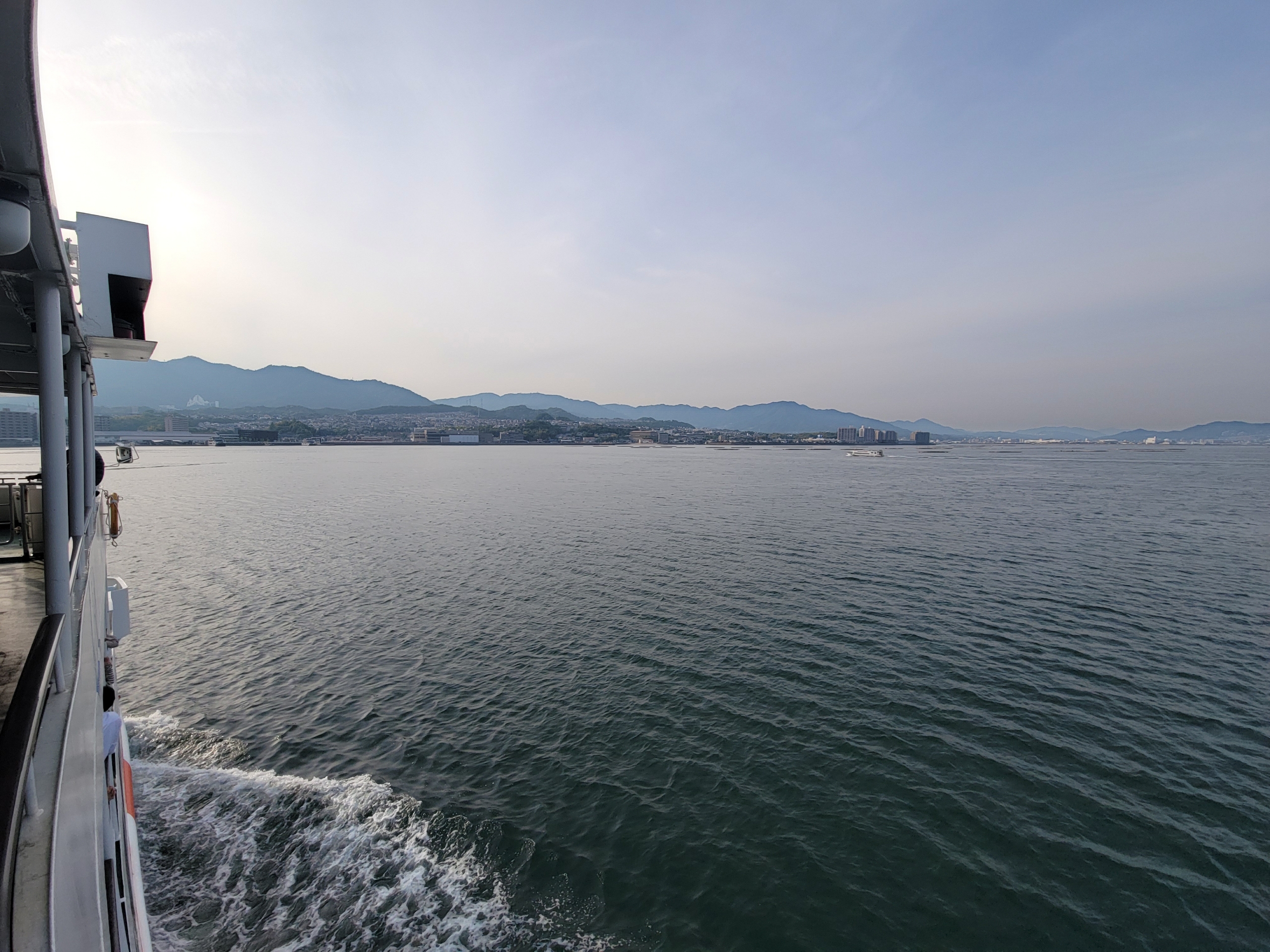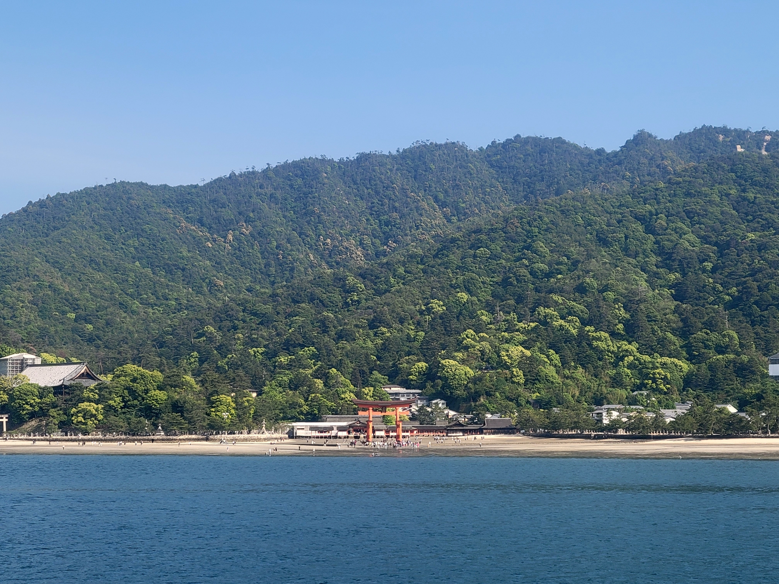 ちょうど大潮の干潮ピーク時間だったので、厳島神社の大鳥居が完全に陸の上に立っていました。そのため、フェリーの航路はかなり遠目を通る航路になりました。