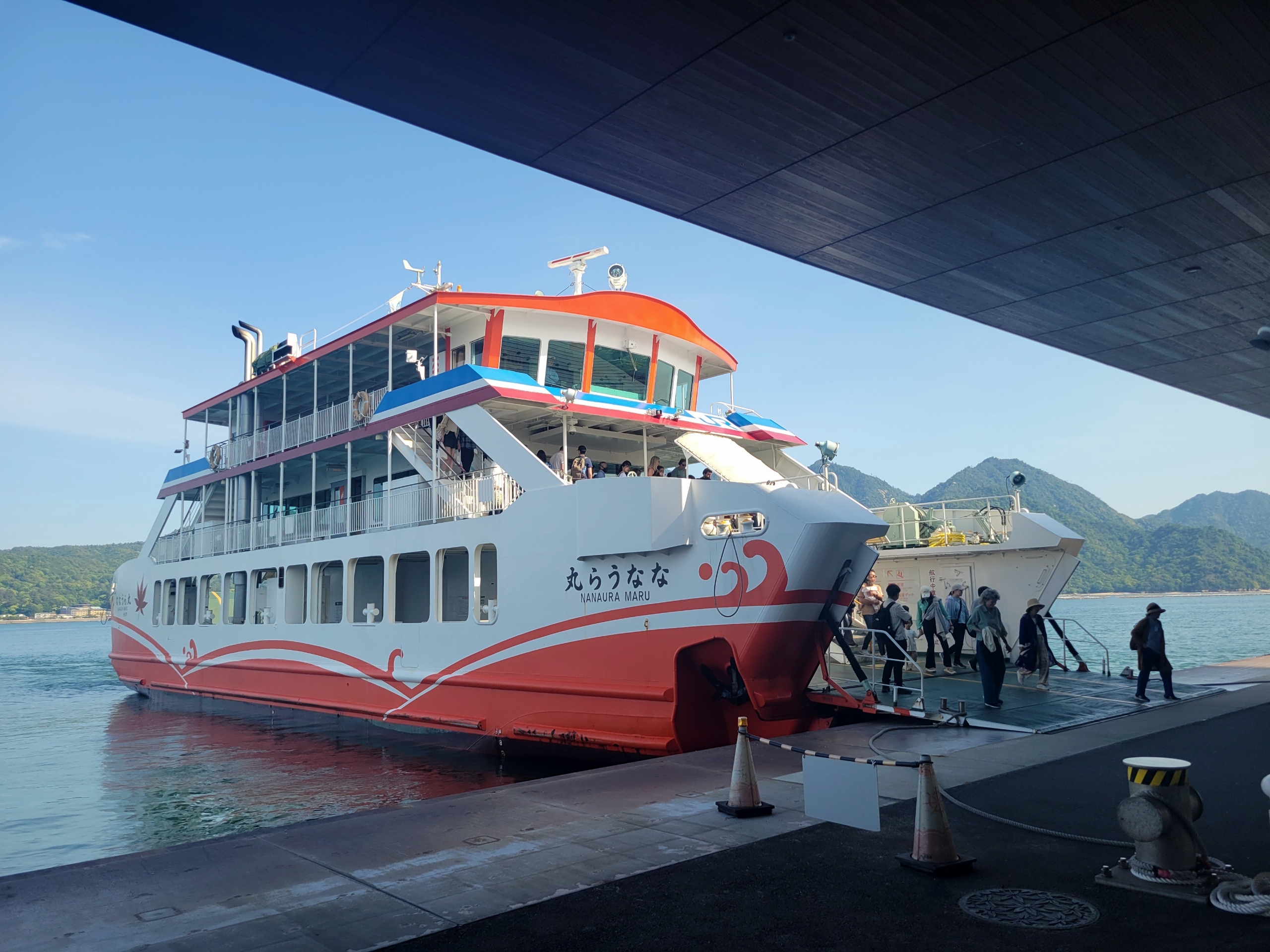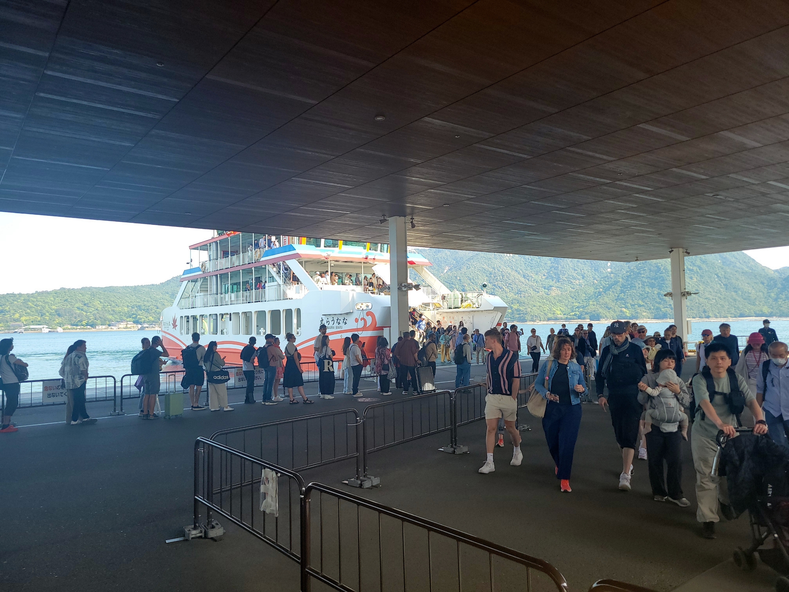 フェリーを降りてくる外国人観光客の多さに驚かされました。京都も多くの観光客で賑わいますが、宮島は日本人観光客が少ない分、外国人の比率がとんでもなく高いことに驚かされますね。全員が船から降りてくるのを待たずに、乗船が開始されました。