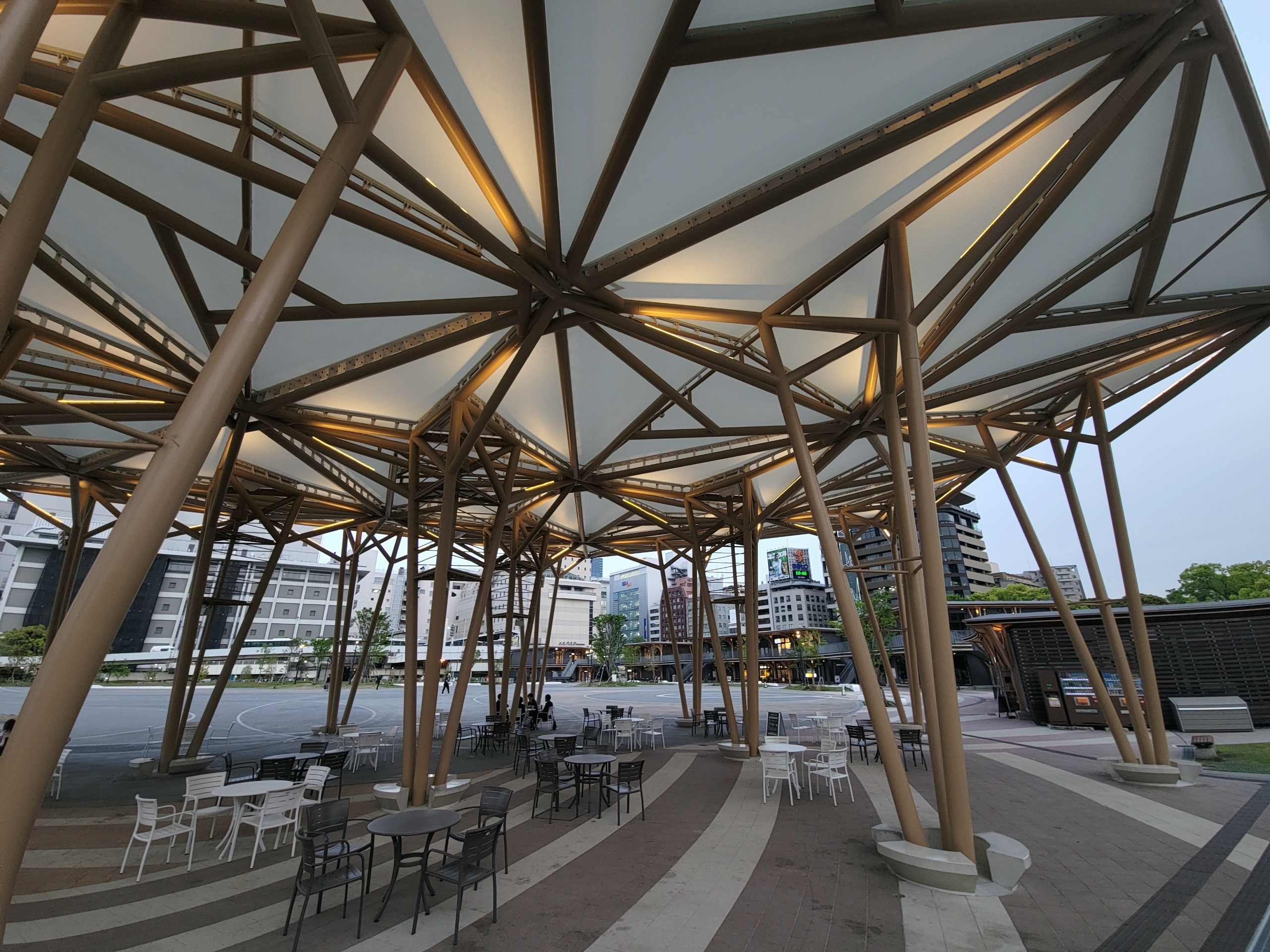 かつて広島東洋カープの本拠地であった広島市民球場跡地に、「ひろしまゲートパーク」が誕生しました。2023年3月31日に開業したこの施設は、中央のイベント広場を中心に、物販・飲食・サービス店舗がC字型に配置されています。さきほど訪れたエディオンピースウイング広島前の「HiroPa」と同様に、最近の都心部における広場整備のトレンドを反映していると言えるでしょう。都心部の広大な敷地を、イベントや憩いの場として活用できる空間に再開発する動きが全国的に見られますね。