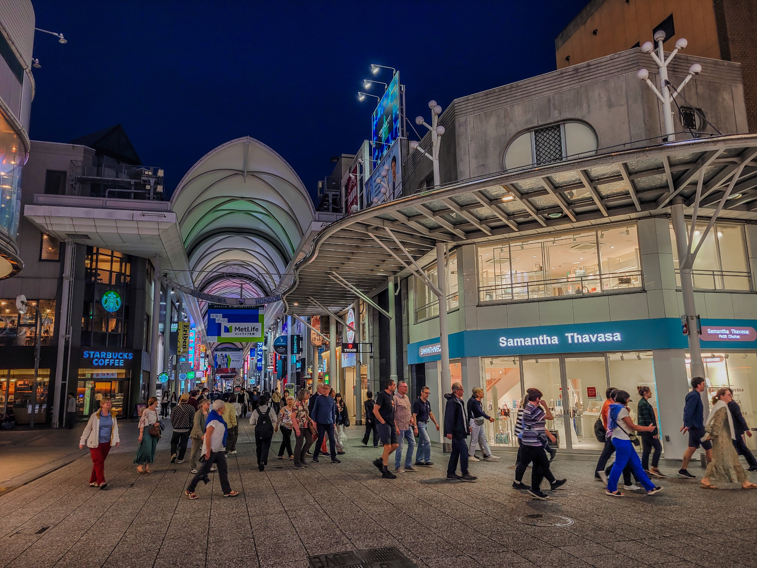 本通商店街は、広島市中区の紙屋町から金座街まで東西約500メートルにわたって続く、広島最大の商店街です。通りを歩くと、日本人だけでなく、実に多くの外国人観光客の姿が目に留まります。欧米人向けと思われるバーが増え、活気あふれる賑わいを見せていました。