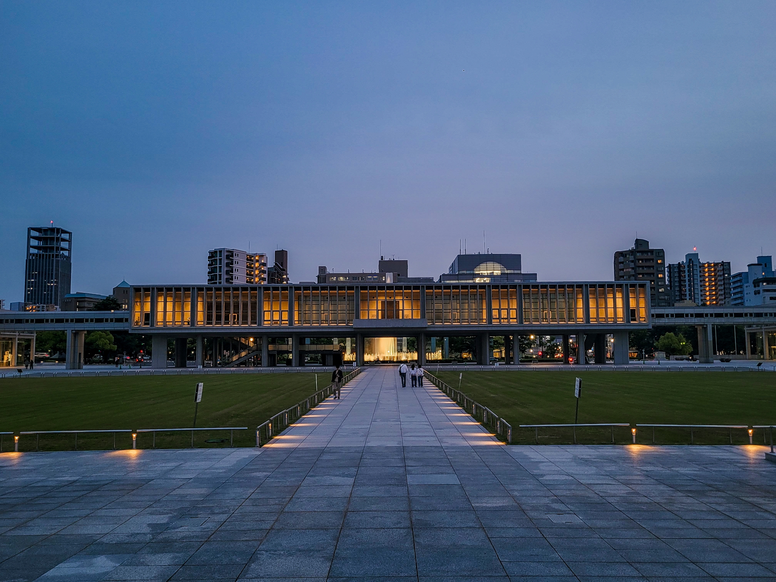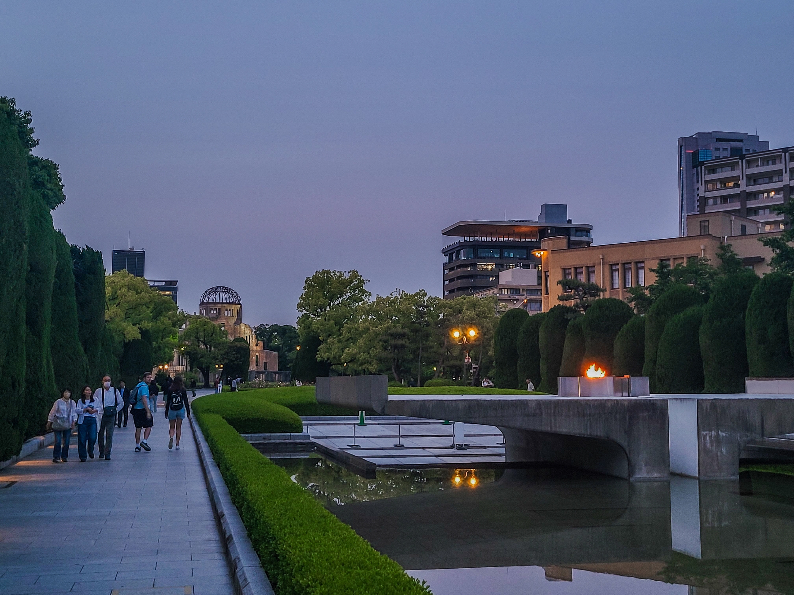 日が暮れてからも平和記念公園を訪れる外国人観光客が多いことに驚かされます。特に、アジア系の方々よりも欧米系の訪問者が多いように見受けられました。これは、広島が平和の象徴として世界的に認知されていることを改めて示していると言えるでしょう。