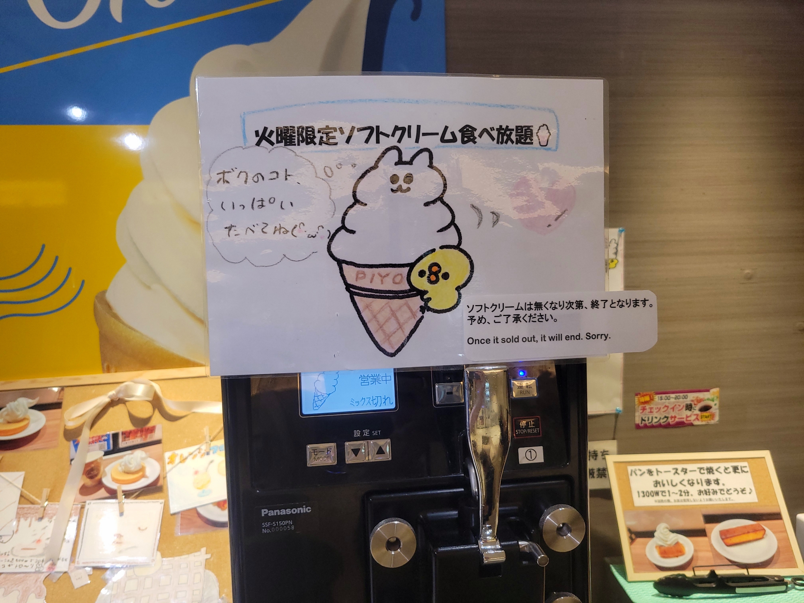近くの人がソフトクリームを食べているのを見て「なぜだろう?」と思って、目に留まった機械には「火曜(今日)限定、ソフトクリーム食べ放題」と記載されていました。 通常は朝食時間帯のみのサービスです。食後にぴったりのこのサービスは嬉しい限りです。この宿は、提供される価格とサービスが全く釣り合っていないと感じるほど、お得に宿泊できています。