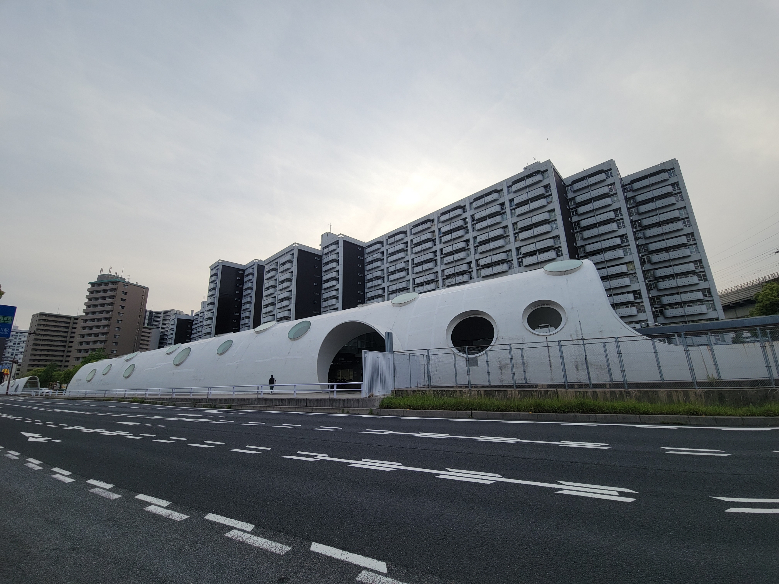 アストラムラインの新白島駅の駅舎は、その近未来的なデザインが印象的ですね。背後にそびえる県営住宅と合わせると、まるで日本の風景ではないかのような、独特の雰囲気を醸し出しています。