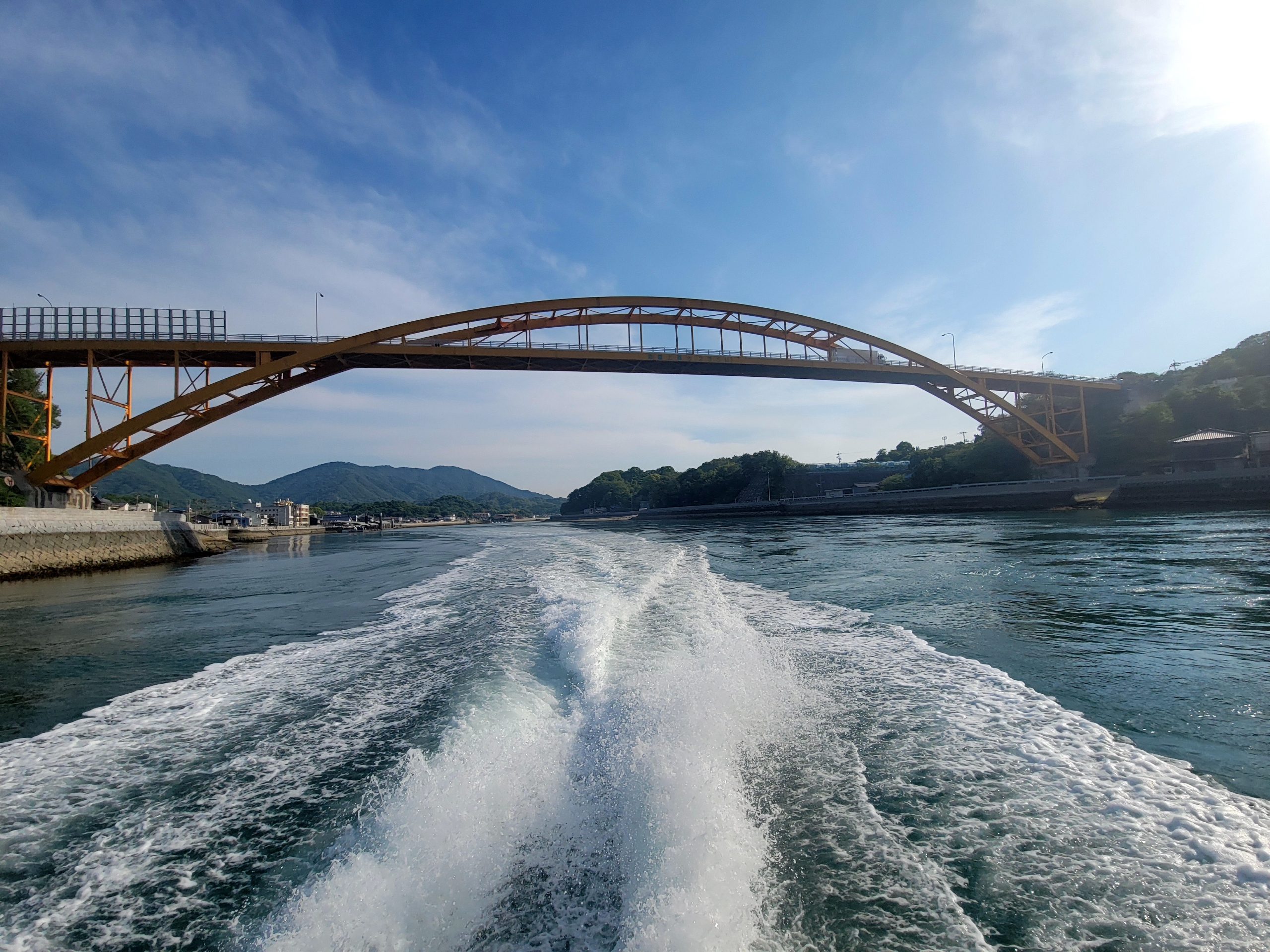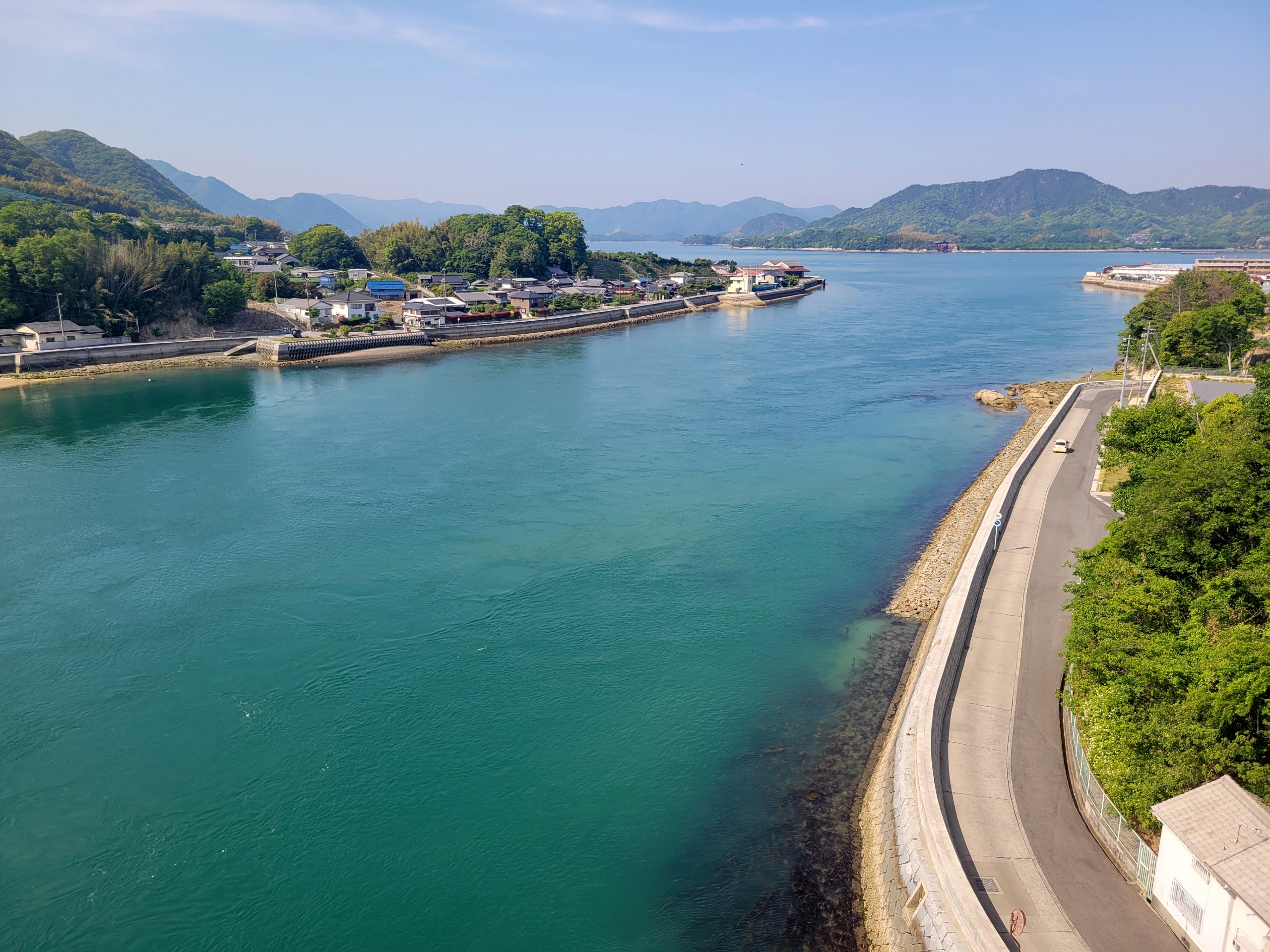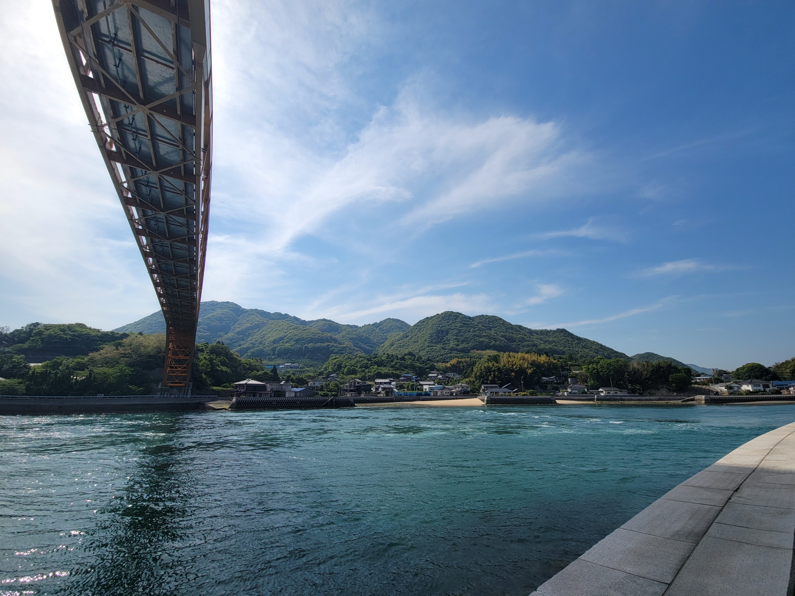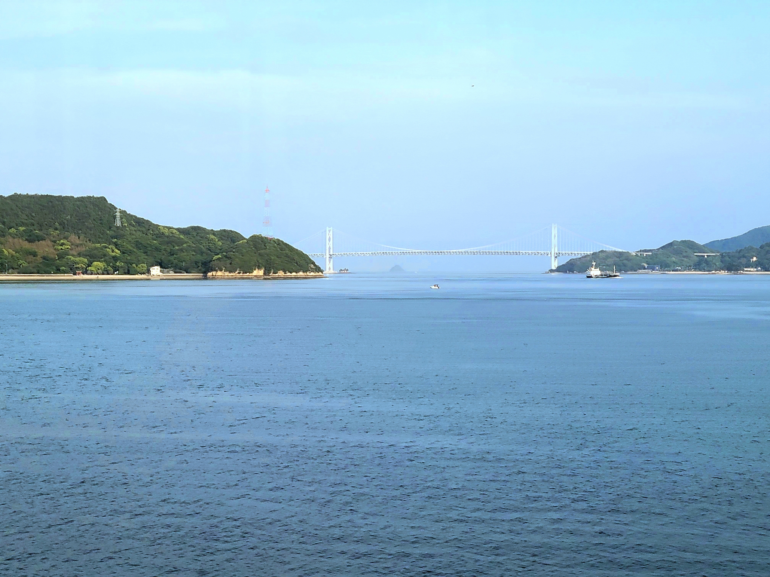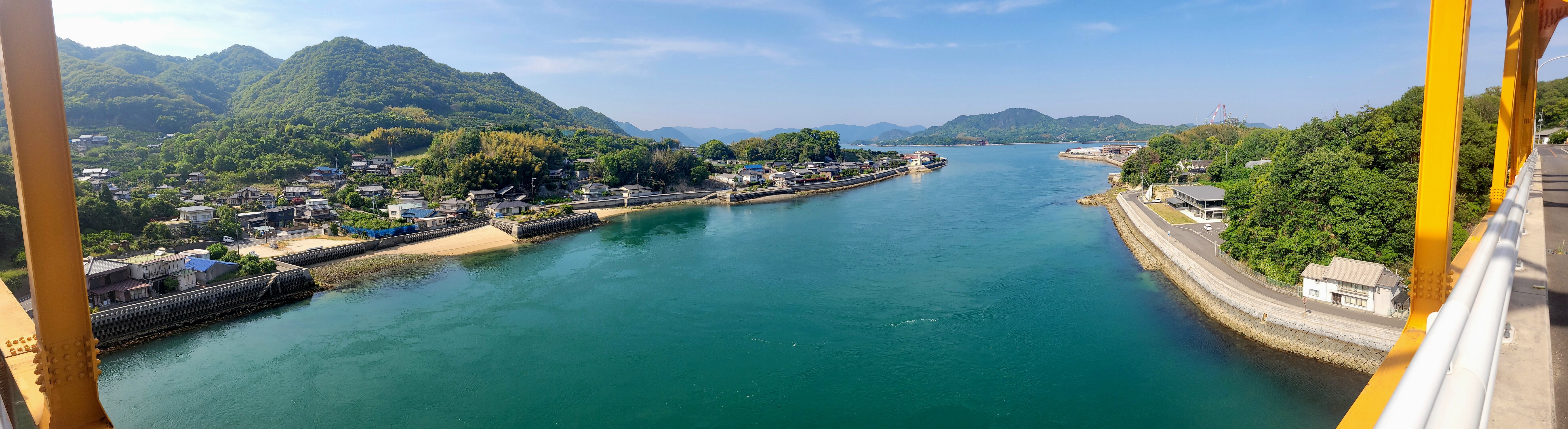 橋の真ん中から眺める景色は素晴らしいですね。目の前に広がる瀬戸田水道は、川のように細く、先ほど潮が勢いよく流れていたことからも、ほんと川と錯覚してもおかしくないほどですね。