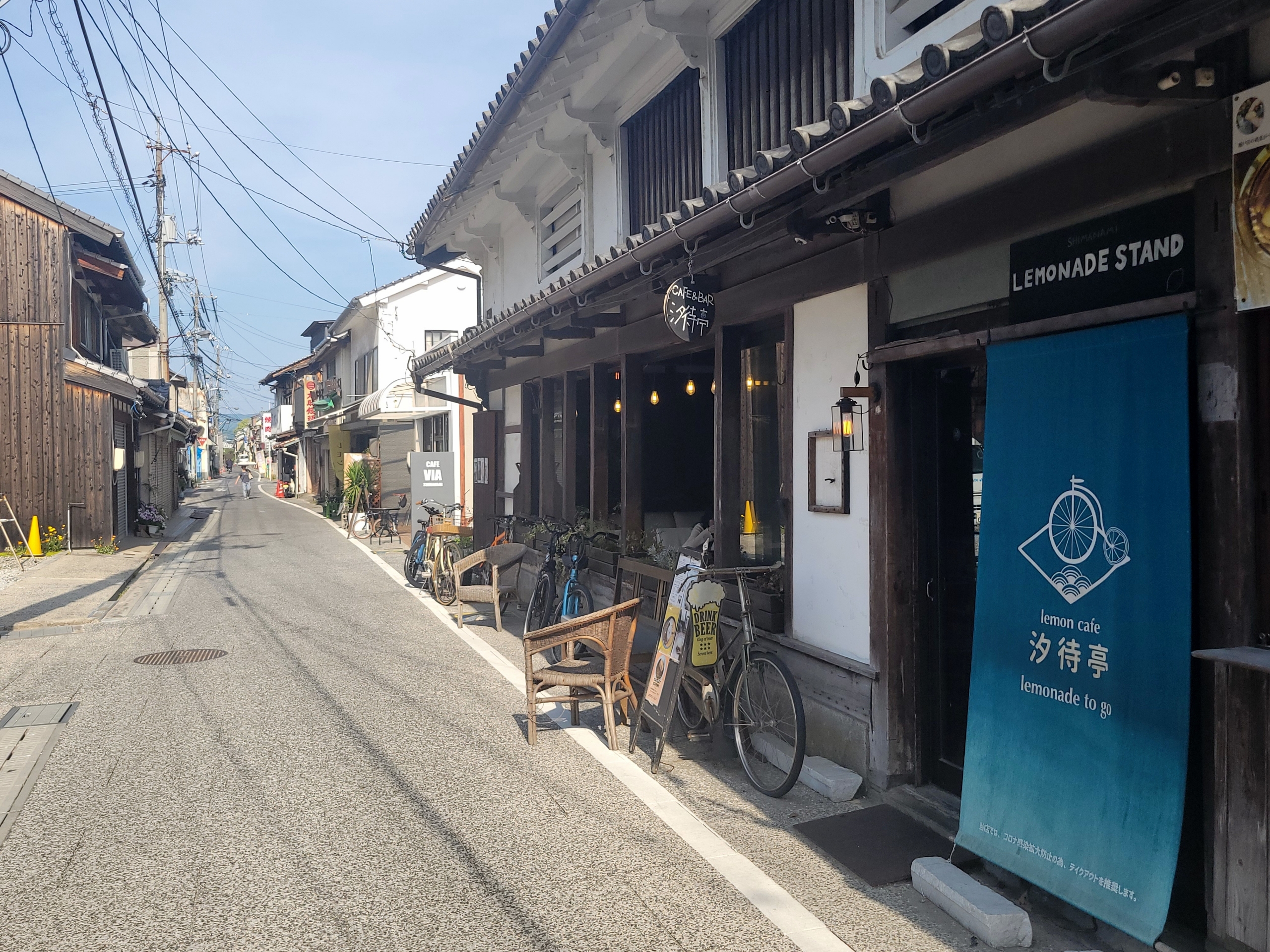 しおまち商店街の中央に位置する「汐待亭」は、築約150年の江戸時代末期に建てられた古民家を改装した魅力的なお店です。しまなみ海道を走るサイクリストにとっての拠点ともなっており、自転車のレンタルやメンテナンスサービスも提供しているようで、店先には多くの自転車が並んでいました。自家製レモネードを飲んで休憩しようと立ち寄ったのですが、すでに15時半のラストオーダーを過ぎており、残念ながら利用できませんでした。