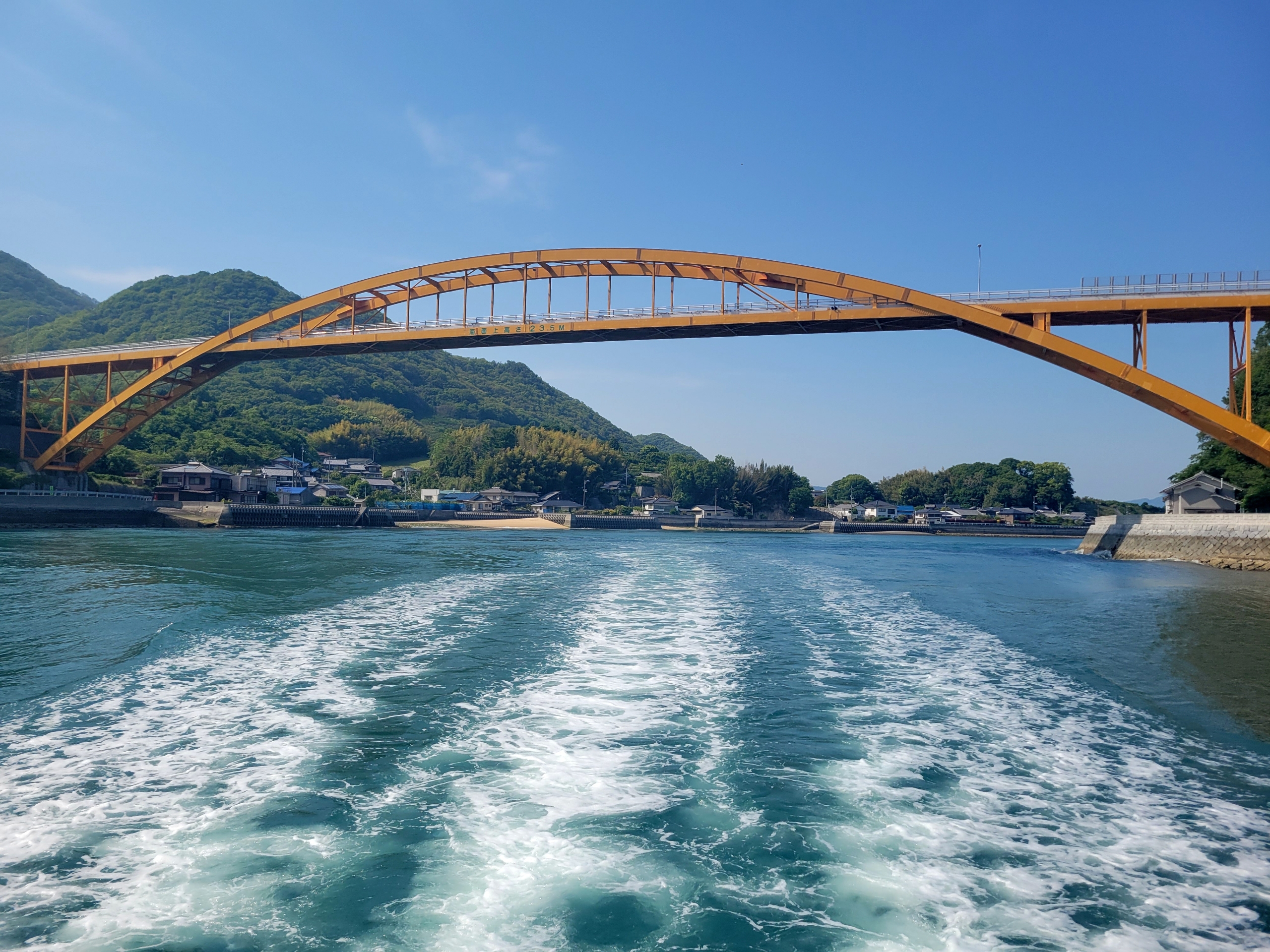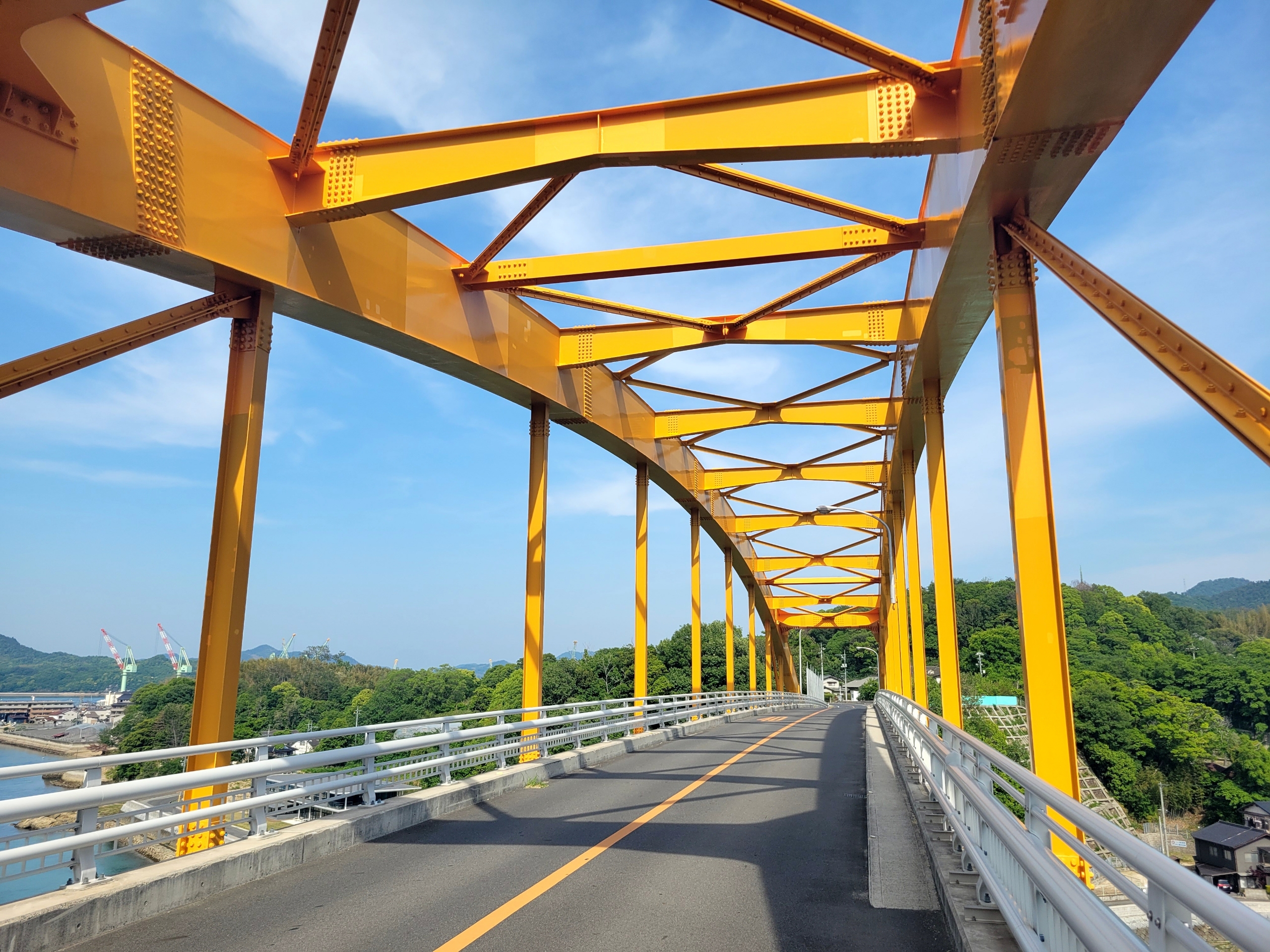 高根大橋と黄色い船が織りなす「黄色コラボ」は、尾道行きの船が遅れたからこそ見ることができた、思いがけない光景です。高根大橋は海面からの高さが23.5mもあり、橋の上からの景色はさぞ良いだろうなと感じました。もともとは瀬戸田のカフェで柑橘系のドリンクでも飲もうと思って来たのですが、先ほど「はっさくチューハイ」を飲んで、少しほろ酔い気分になって満足していたこともあり、この橋が人間も渡れるようなので行ってみることにしました。