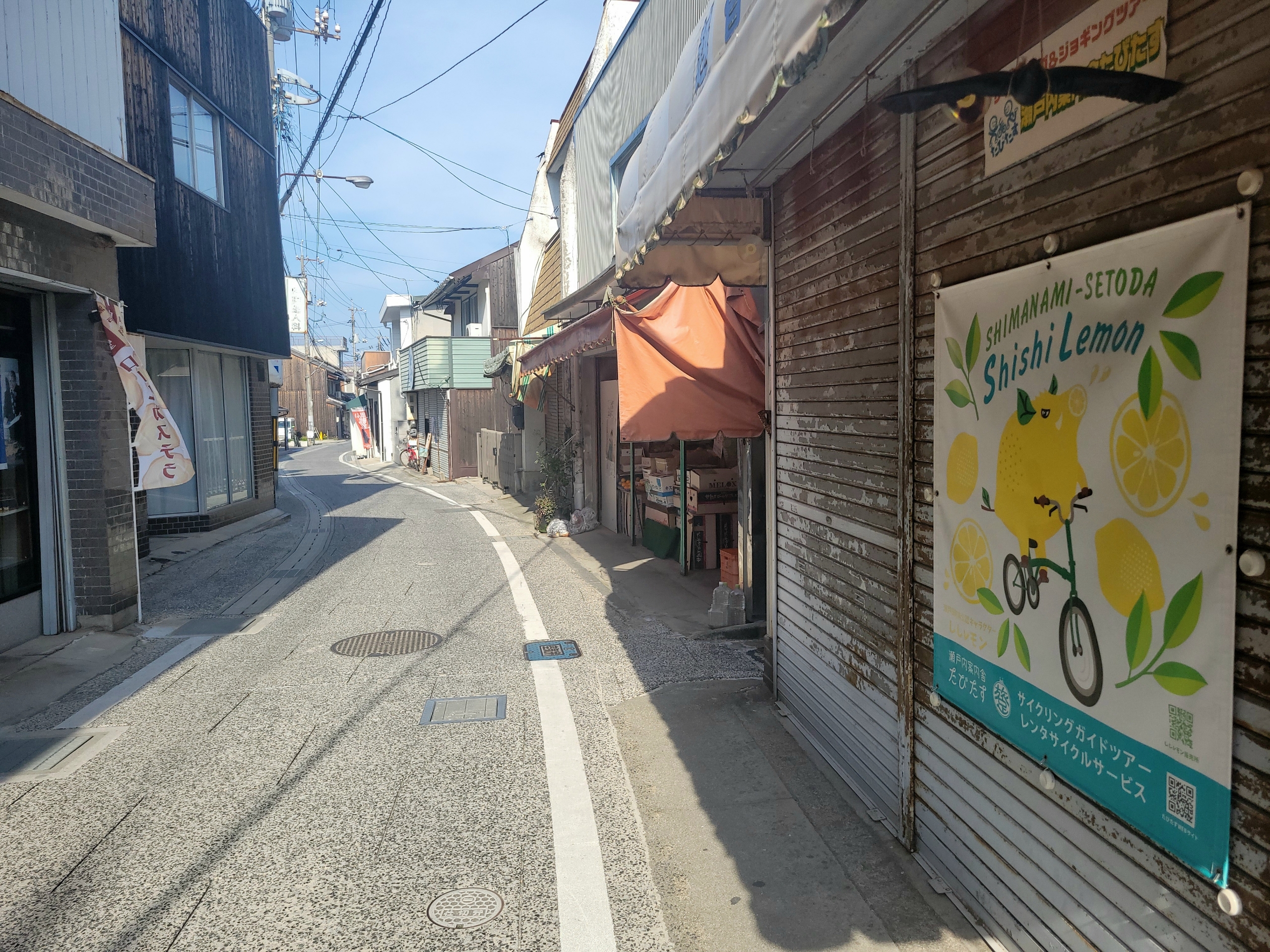 眺めの良さに時間を忘れ、高根大橋の上で20分ほど滞在していました。橋を渡りきって高根島にほんの少しだけ足を踏み入れ、再び生口島へと戻ります。帰りはしおまち商店街を通って帰ることにします。