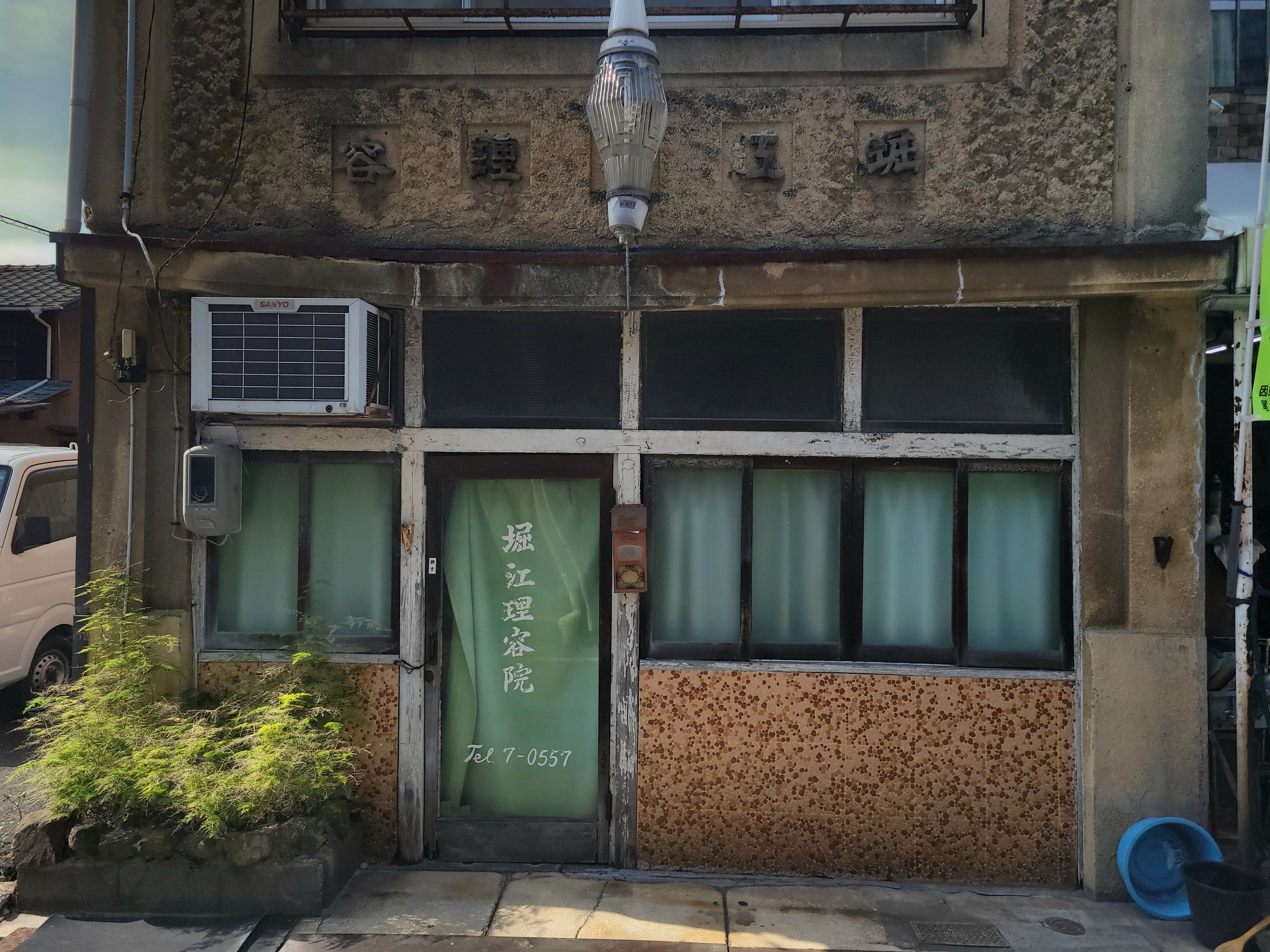趣のある建物が目を引く「堀江理容院」。営業されているのかどうか、外観からは判断しにくいですね。
