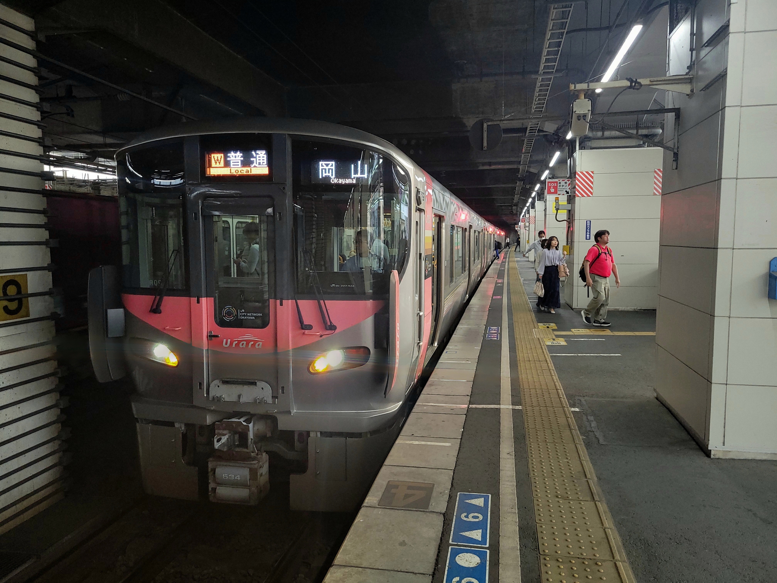 行きの「ひかり」号が各駅停車でも追い抜きなしで進んだのに比べ、やはり「こだま」は随分とゆっくりな運行だと感じました。岡山駅や姫路駅で10分以上もの通過待ち停車があっただけでなく、通過待ちのない駅でも3分ほど停車するなど、まさに「こだま」らしい、じっくりと時間をかけた移動となりました。