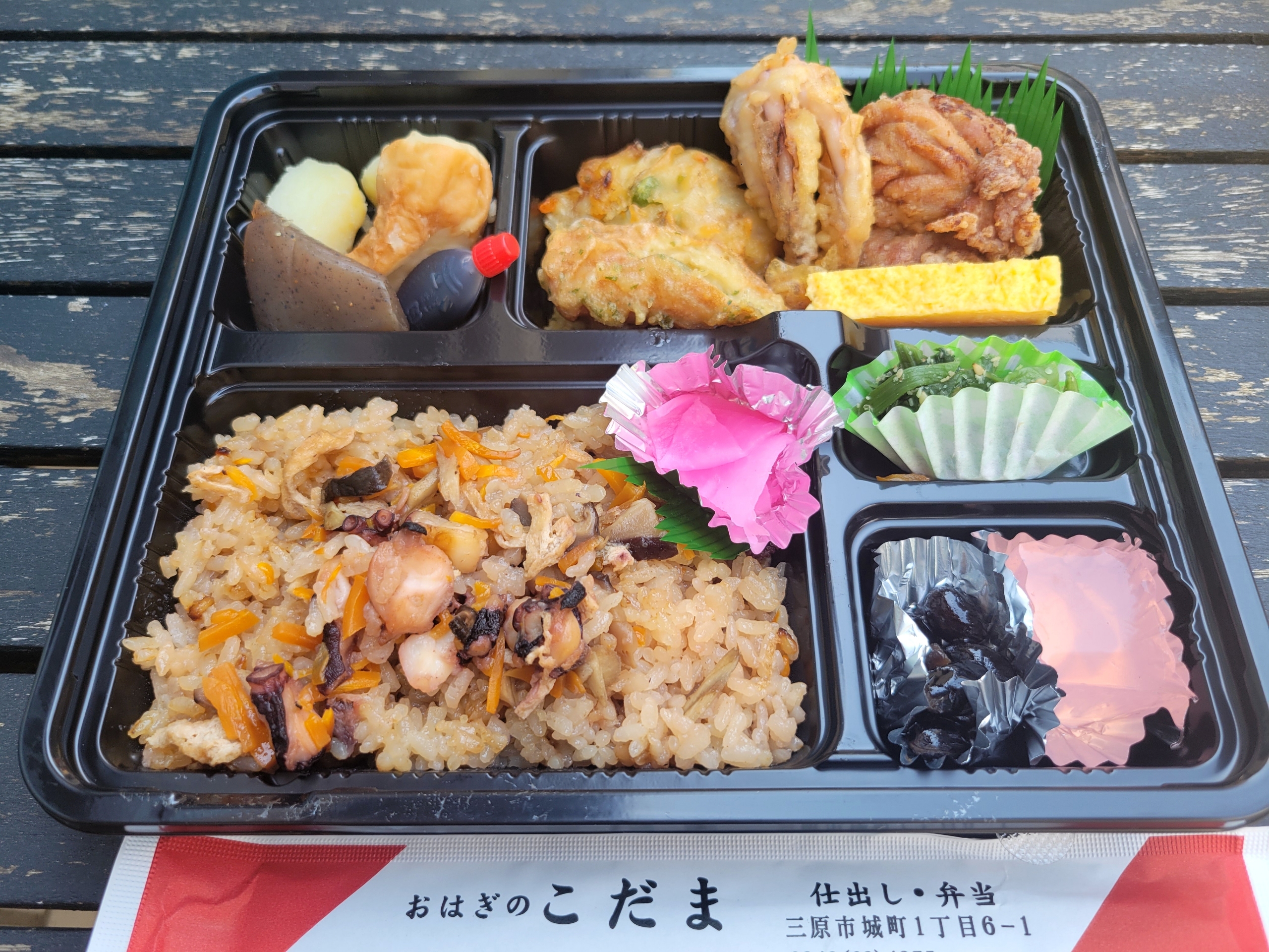 ゲソ揚げ、鶏唐揚げ、煮物と、おかずも充実していてボリューム満点。本当に美味しかったです。あのタコ飯の味が忘れられず、帰りにも立ち寄ろうとしたのですが、残念ながら売り切れていました。