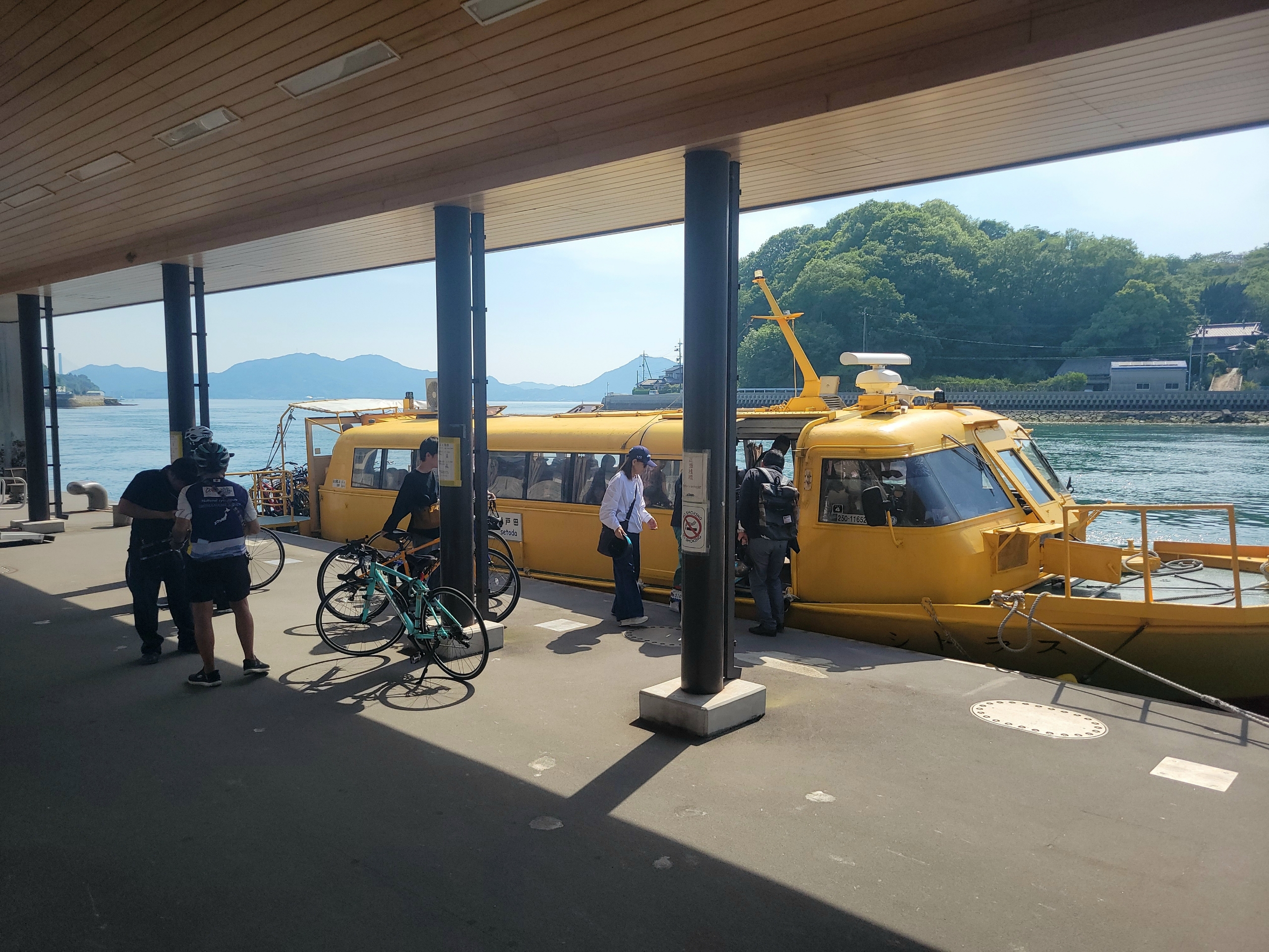 サイクリストの自転車で溢れかえっている尾道行きのフェリーは、乗船作業に手間取っている様子でした。船内も多くの乗客で賑わっていますが、目立つのはやはり欧米の方々ですね。